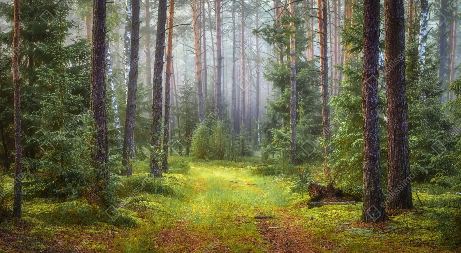 Eine ruhige, neblige Kiefernwaldszene bringt beruhigendes Grün und natürliche Tiefe in jeden Raum.