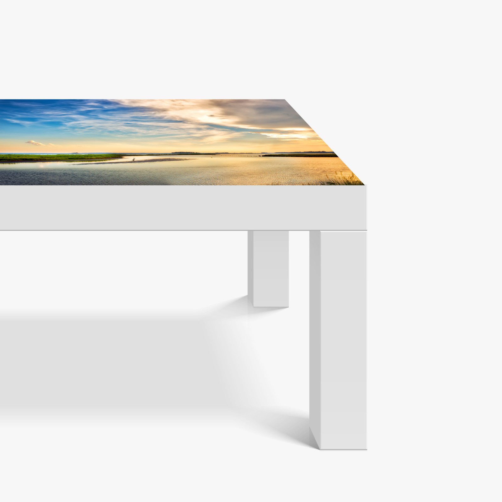 Ein ruhiger Sonnenuntergang über der Chesapeake-Bucht mit einem einsamen Reiher auf einer Marschinsel, perfekt zur Gestaltung naturnaher Räume.