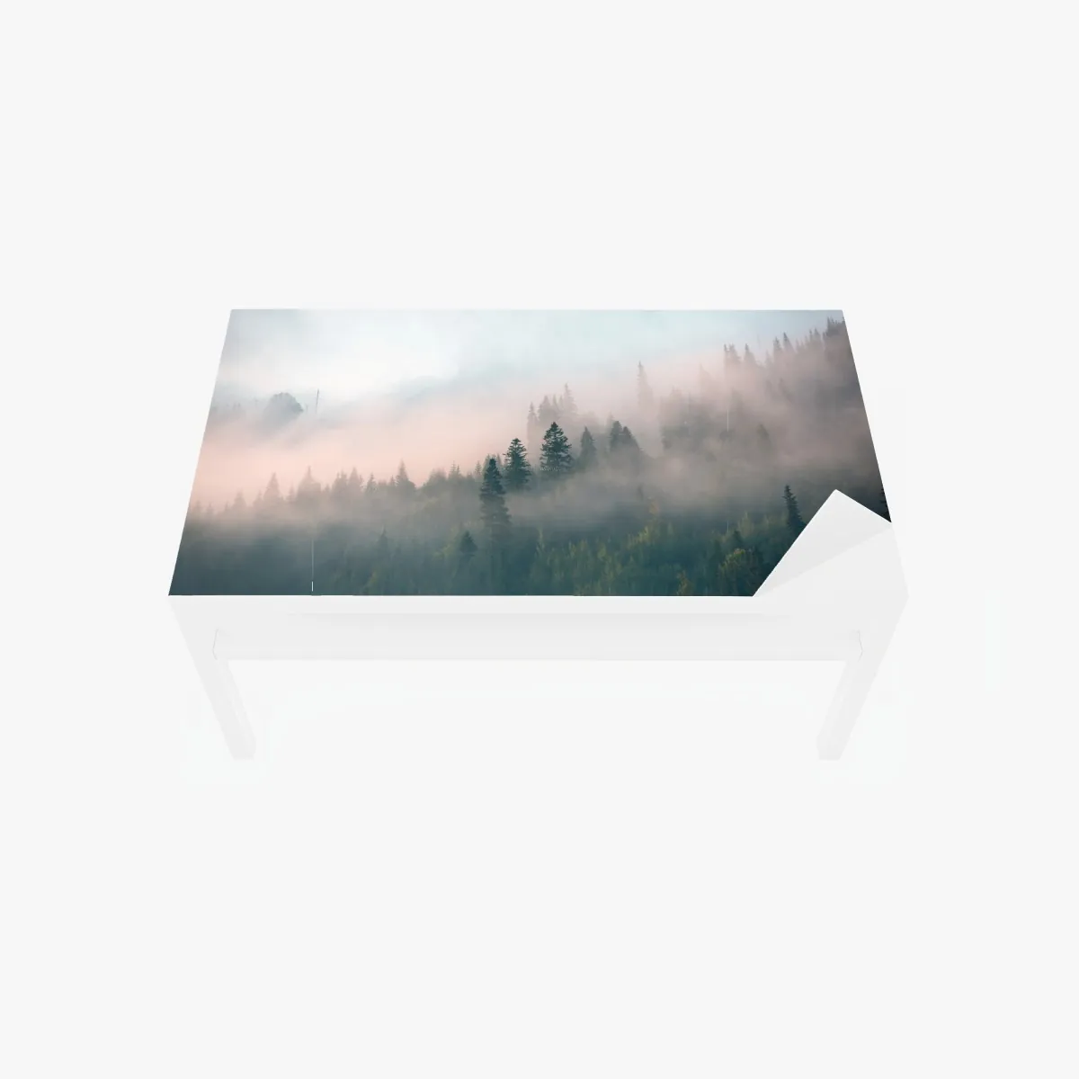 Morgennebel zieht durch den Tannenwald und schafft eine ruhige, traumhafte Landschaft, die natürliches Flair in Ihr Zuhause bringt.