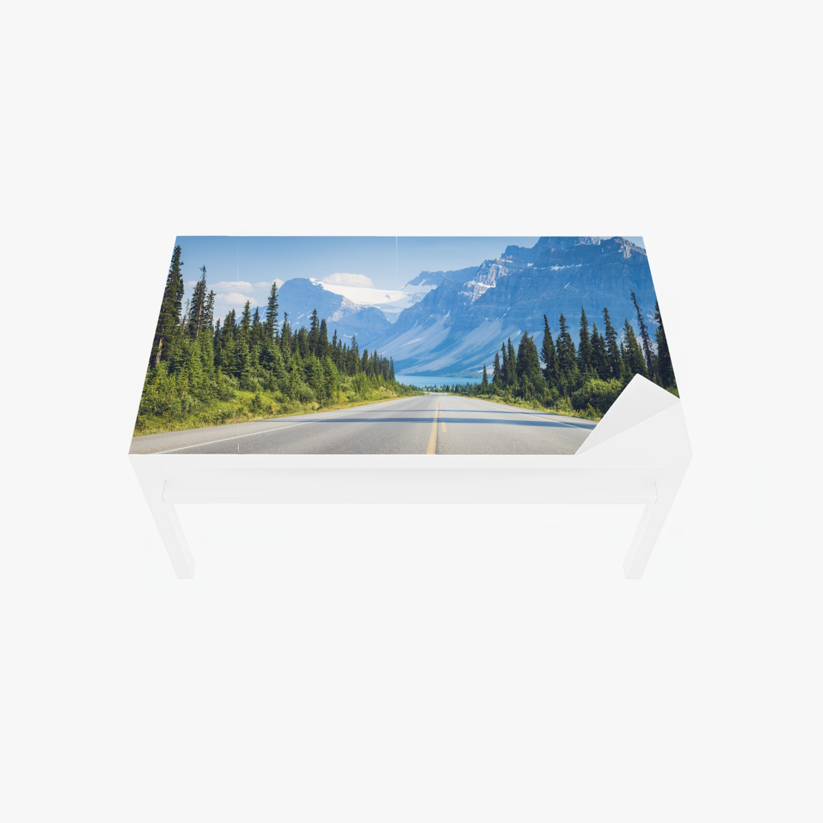 Tischaufkleber und Schreibtischaufkleber Straße durch kiefernwald zu gletschersee und bergen