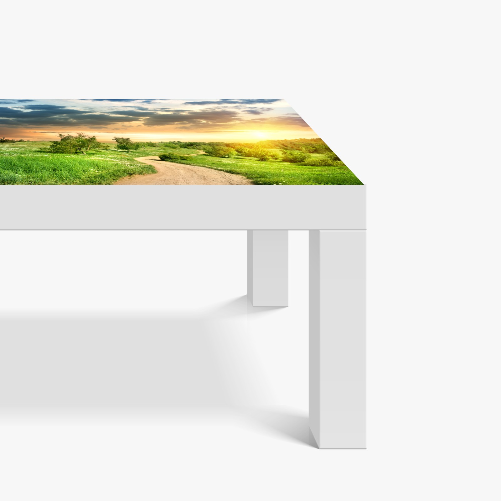 Tischaufkleber und Schreibtischaufkleber sonnenuntergang über einem feldweg durch grüne wiese
