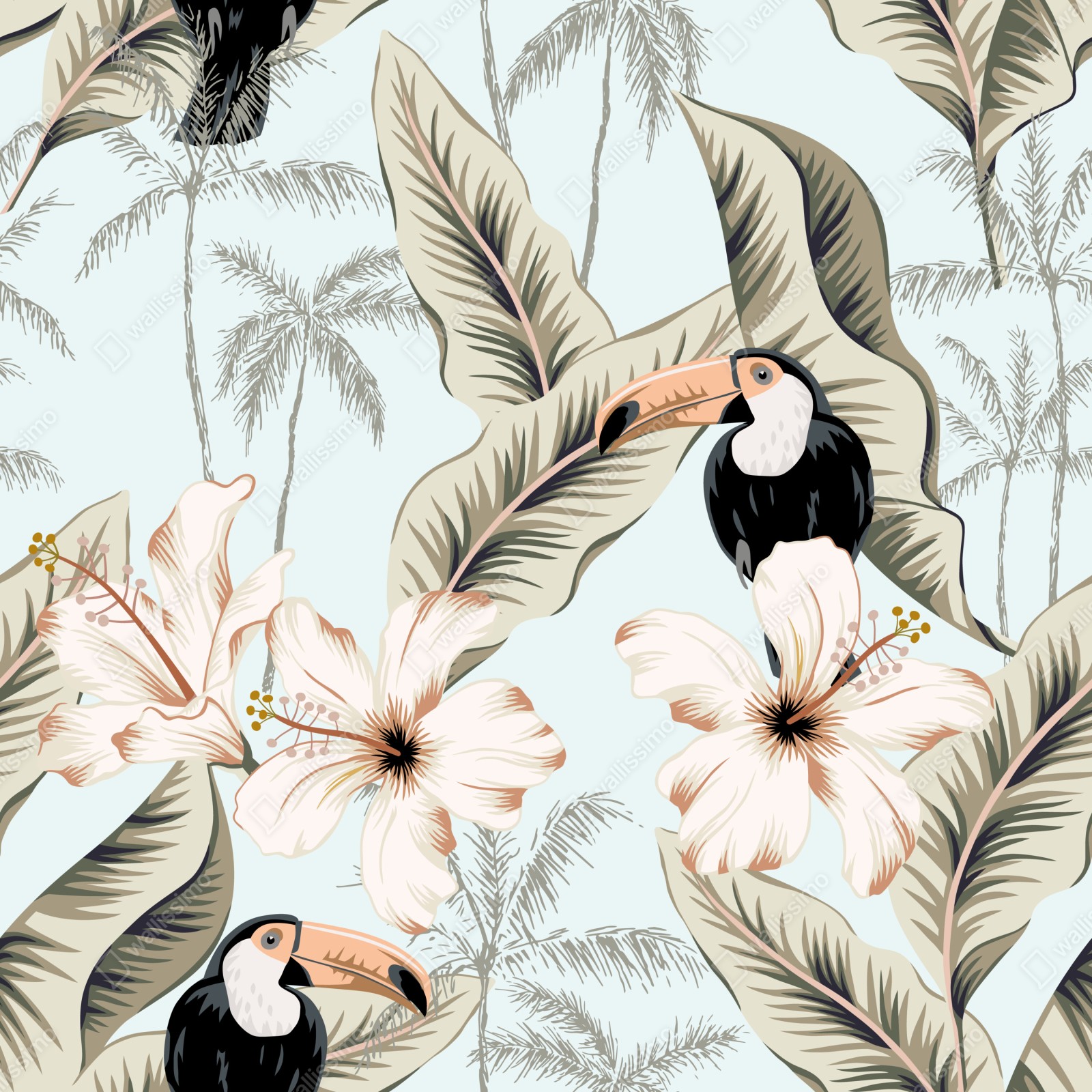 sanftes pastell-tropenmotiv mit tukanen, hibiskusblüten und palmenblättern, das boho-flair in jeden wohnraum bringt.