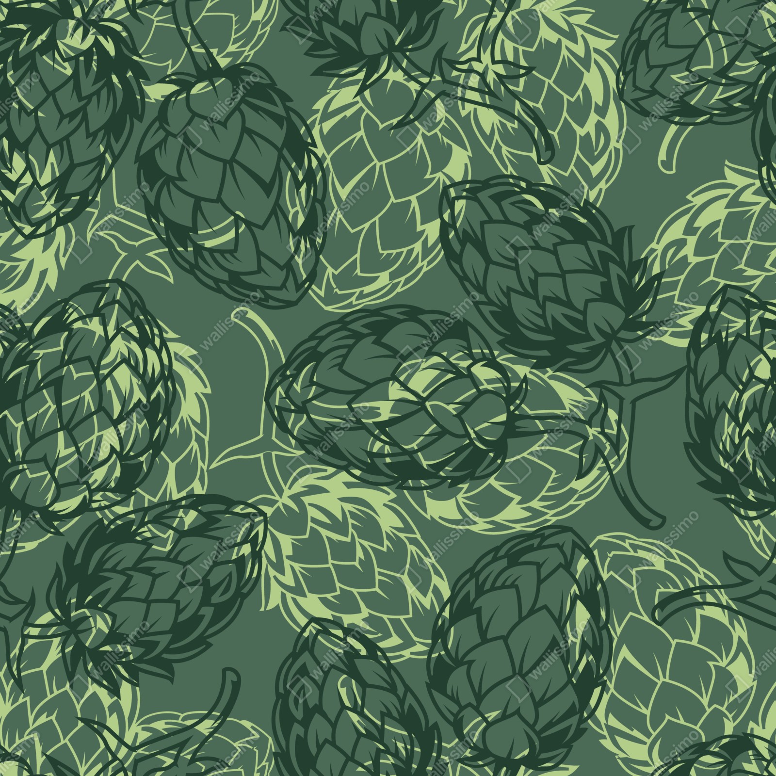 Ein mehrschichtiges Hopfenmuster in grünen Tönen, das rustikales Brauereiflair und botanische Textur in jeden Raum bringt.