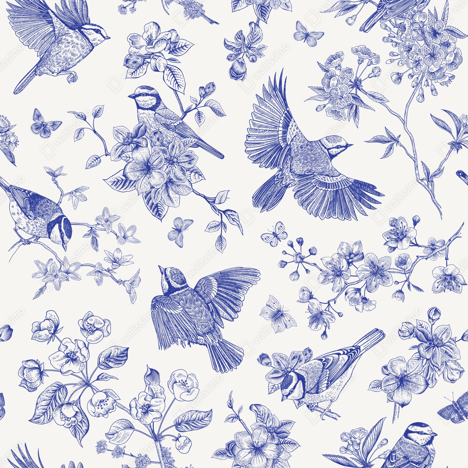 Elegante blaue Illustration von Vögeln und Blumen im Toile-Stil verleiht jedem Raum zeitlosen Charme.