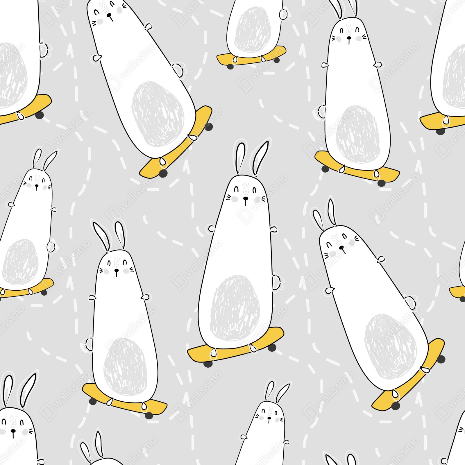 Niedliches nahtloses Muster mit skateboardenden Kaninchen auf sanftem grauen Hintergrund, ideal zur Dekoration von Kinderzimmern.