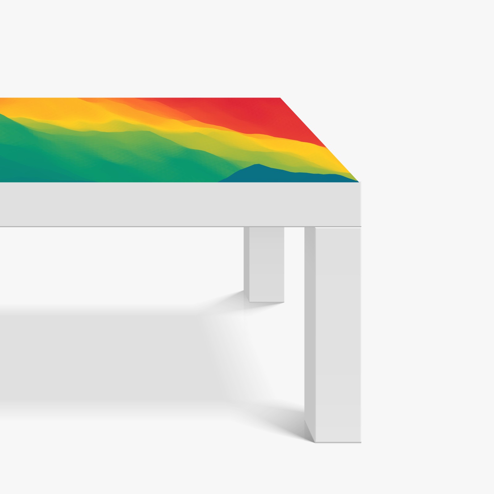 Ein kräftiger abstrakter Verlauf mit geschichteten Bergsilhouetten in leuchtenden Farben, der jeden Raum belebt.