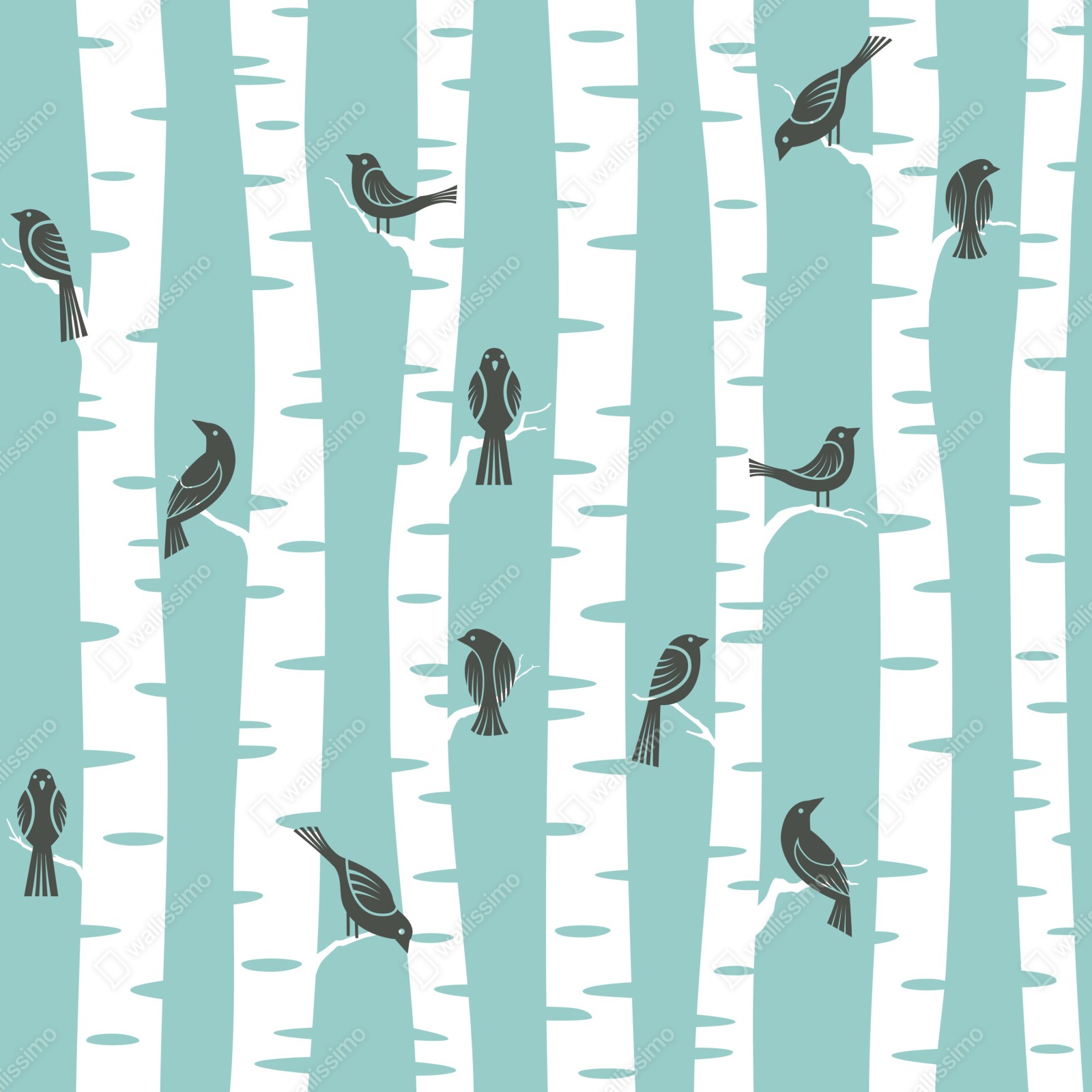 Charmantes, vom skandinavischen Stil inspiriertes Muster aus Birken und Vögeln in sanftem türkis und grau bringt ruhige, verspielte Atmosphäre ins Kinderzimmer oder Wohnzimmer.