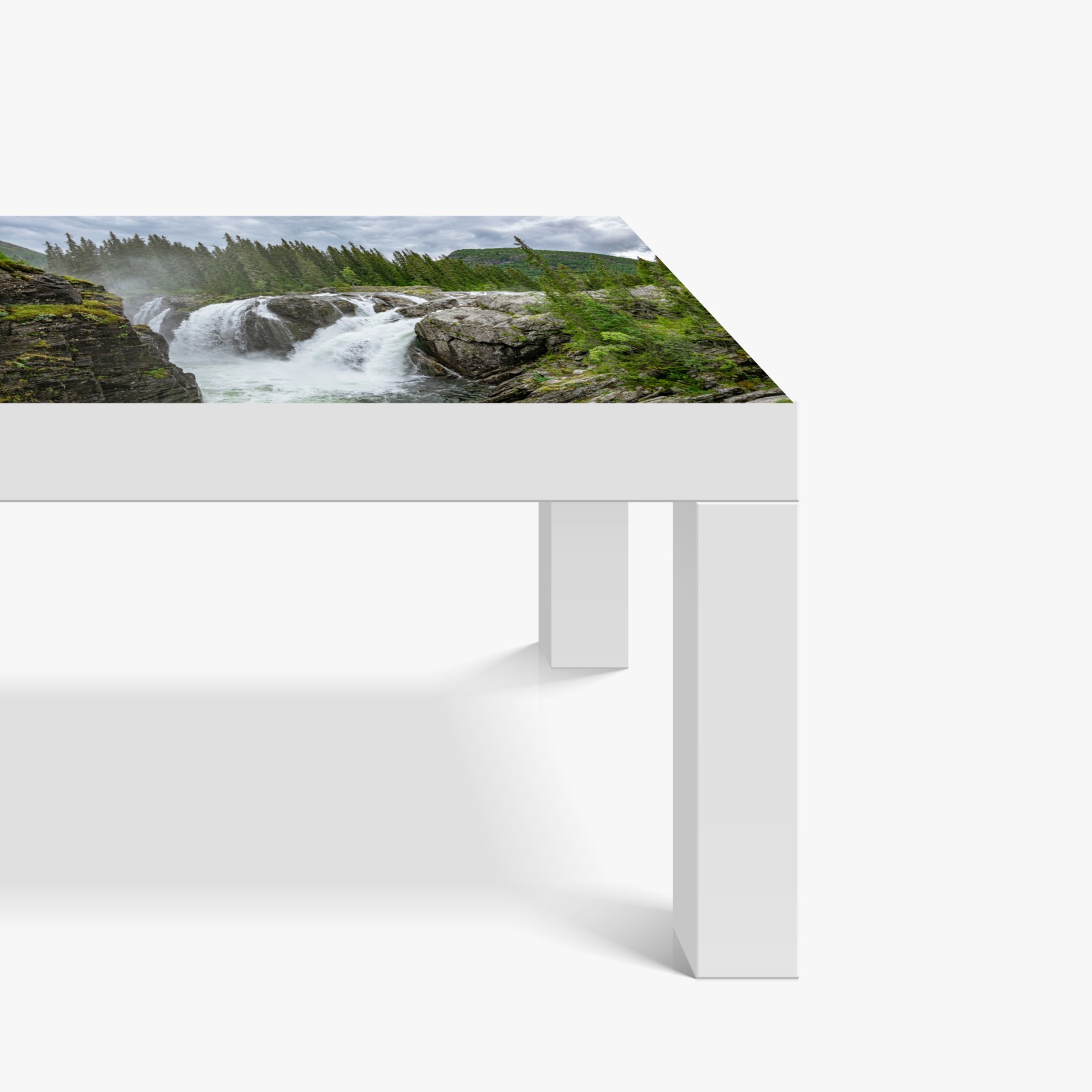 Tischaufkleber und Schreibtischaufkleber nebliger wasserfall im dichten kiefernwald