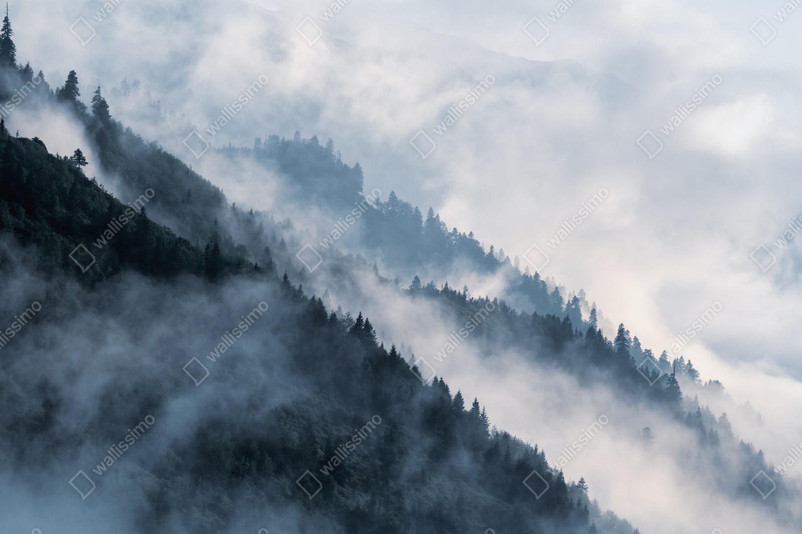 Eine ruhige neblige Berglandschaft, die jedem Raum eine naturverbundene und entspannende Atmosphäre verleiht.