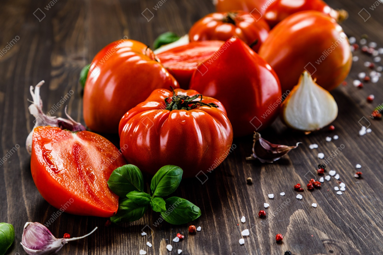 Lebendige Nahaufnahme von reifen Tomaten mit Basilikum und Knoblauch auf einer rustikalen Holzoberfläche, perfekt um Küche oder Essbereich zu beleben.