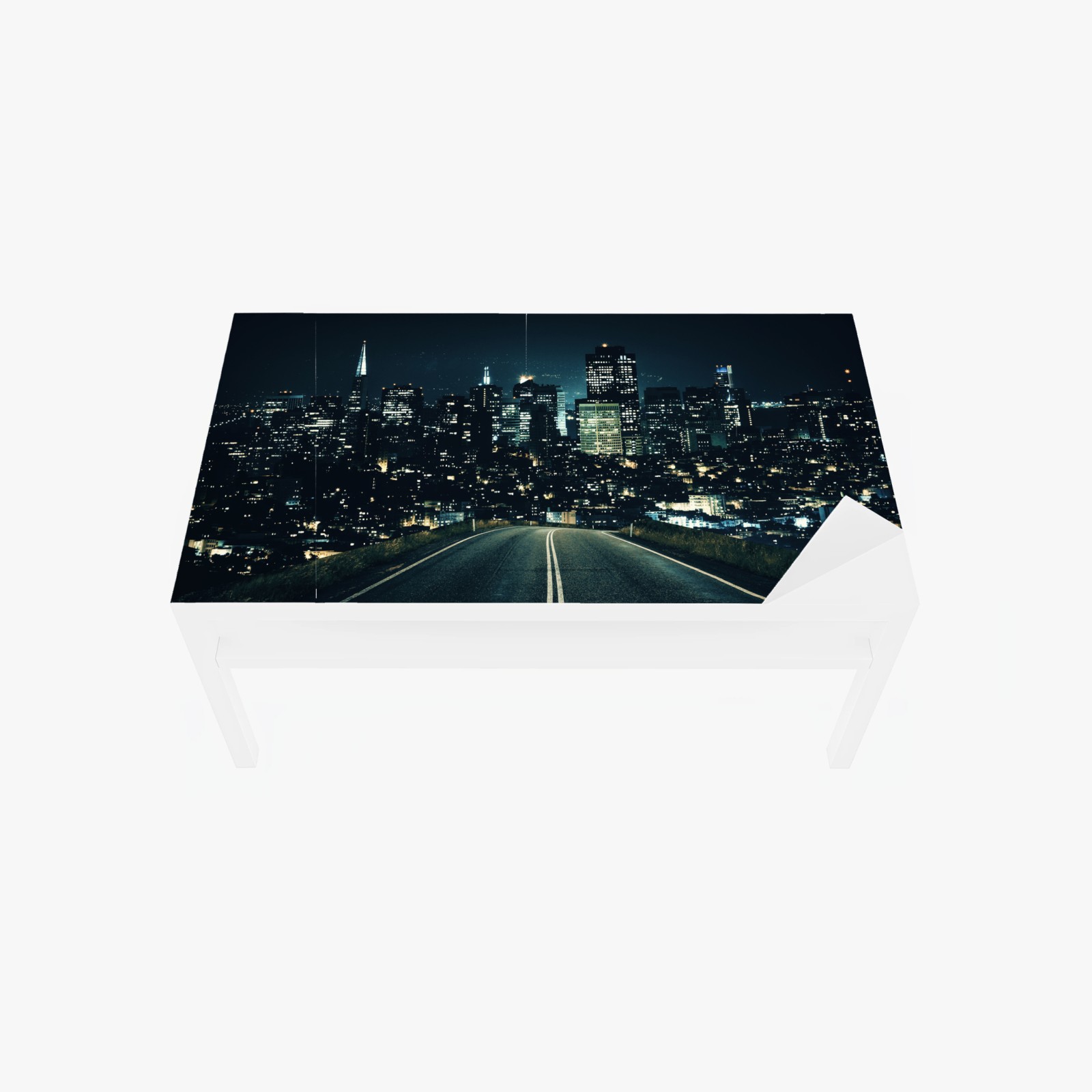 Tischaufkleber und Schreibtischaufkleber Straße zur beleuchteten stadtsilhouette bei nacht