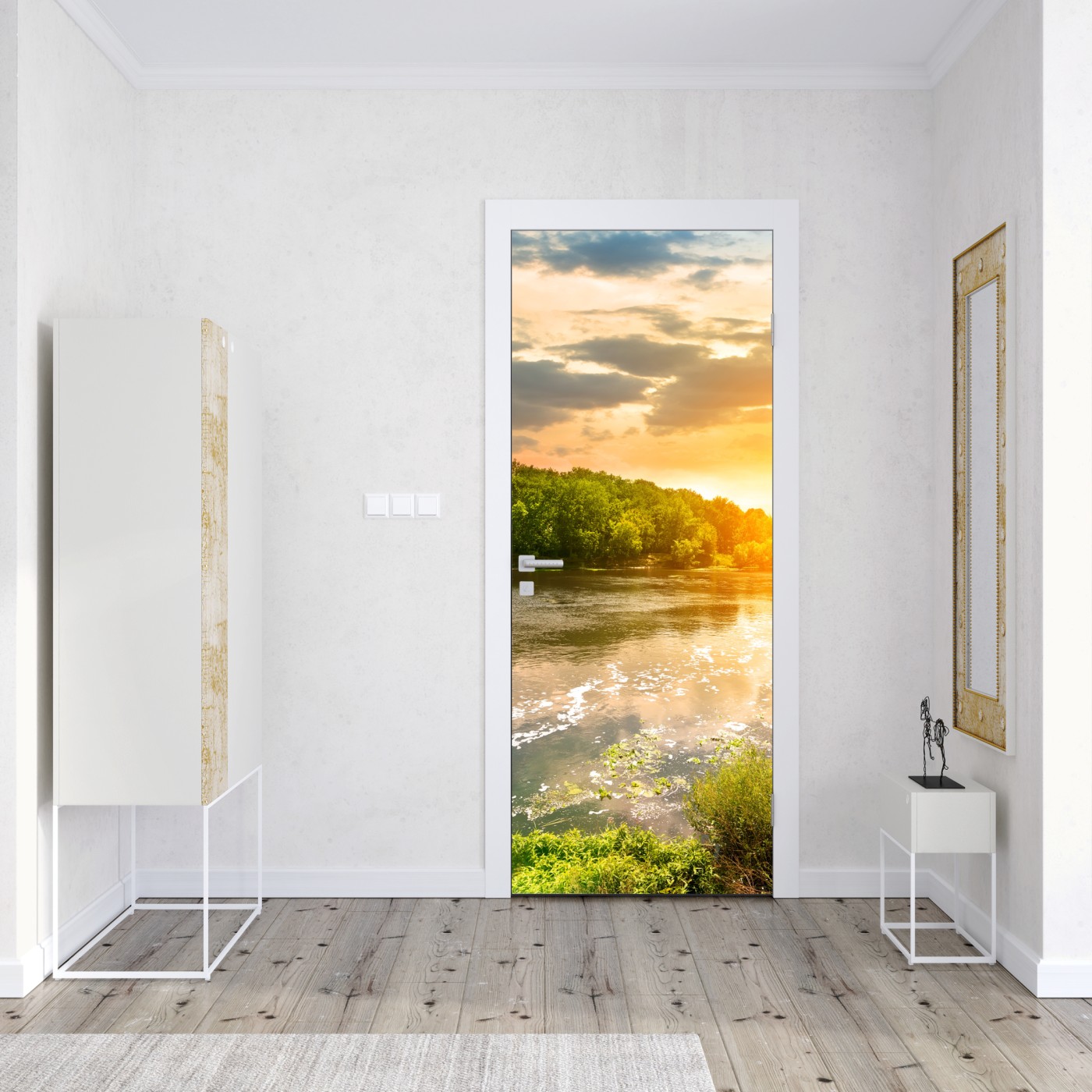 Türaufkleber Ruhiger sonnenuntergang am fluss im grünen wald