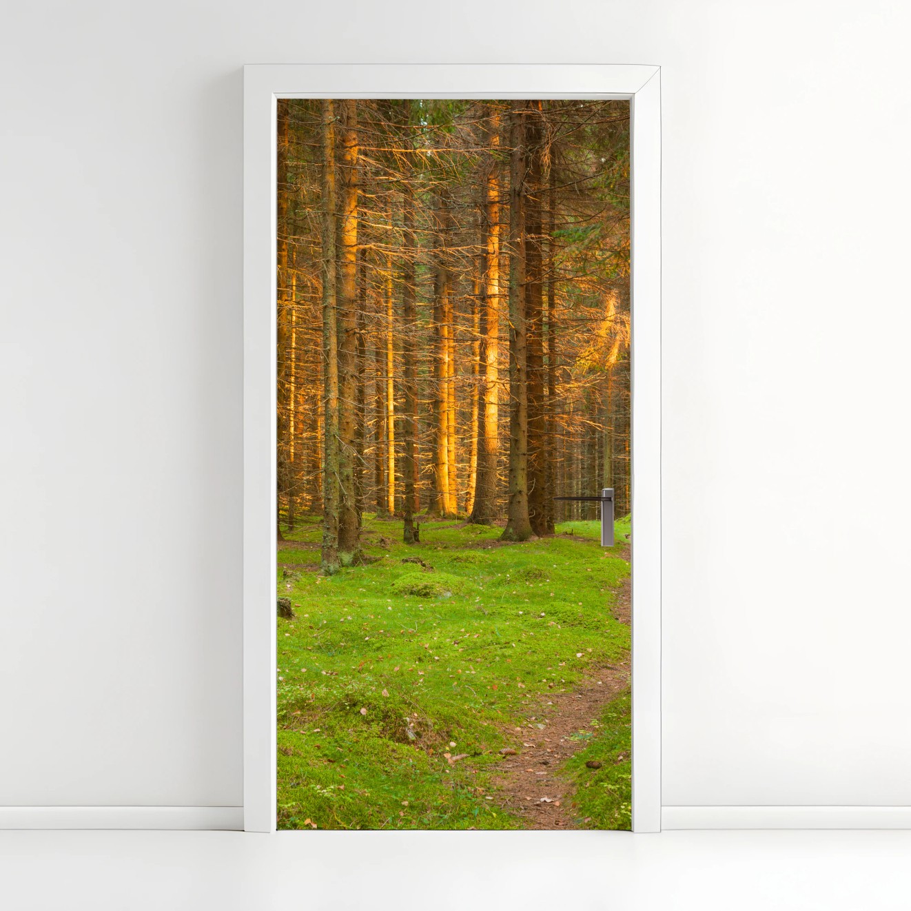 Türaufkleber Goldenes licht im moosbedeckten kiefernwald