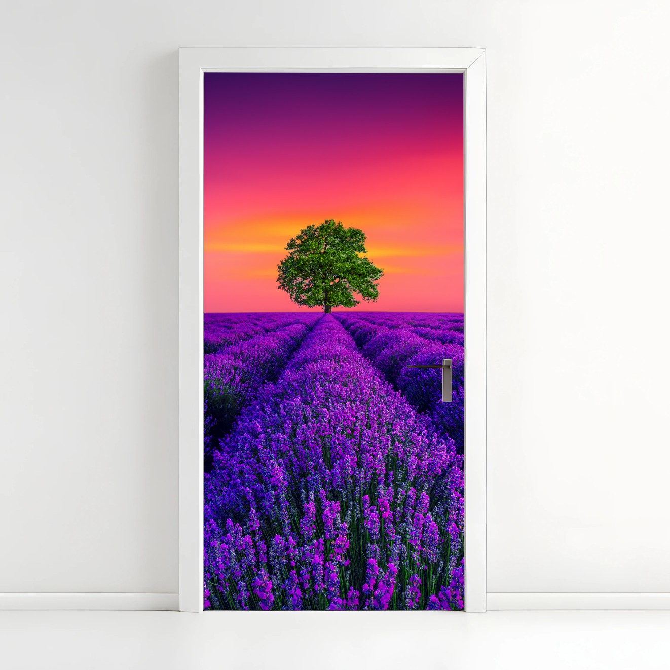 Türaufkleber Lavendelfeld bei sonnenuntergang mit einsamem baum
