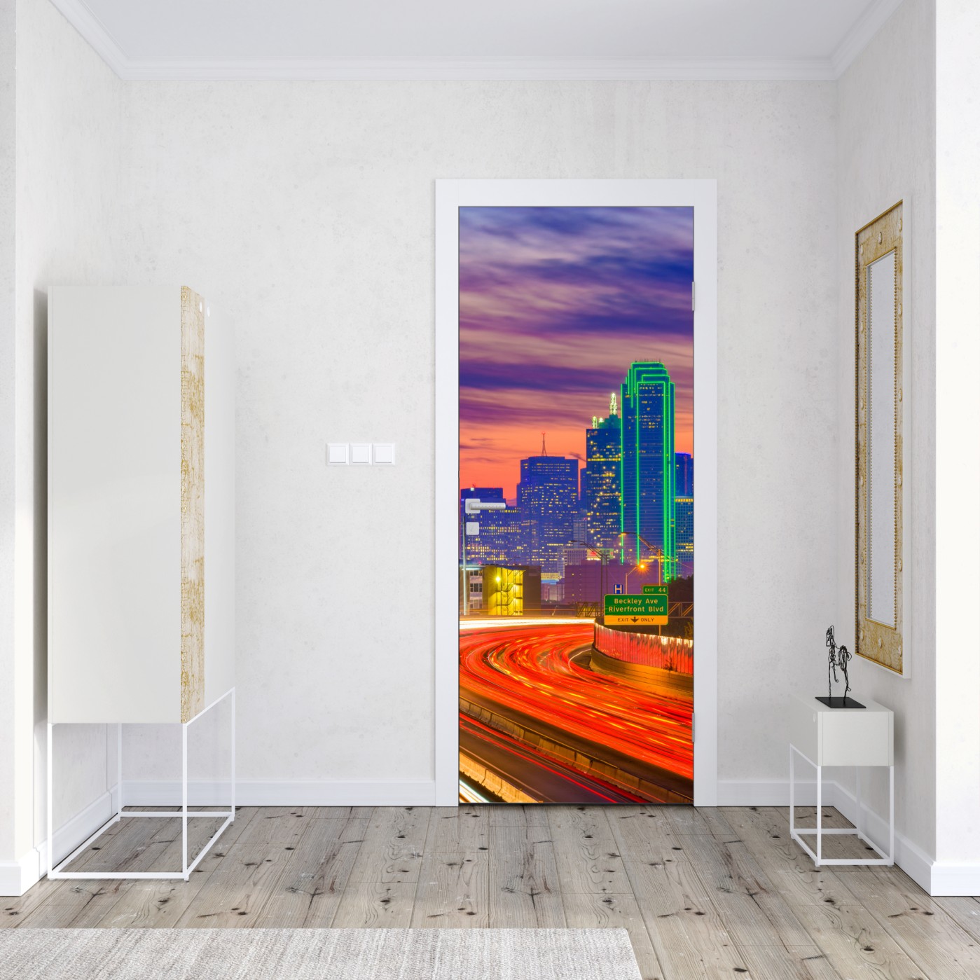 Türaufkleber Panorama von Dallas bei sonnenuntergang mit lichtspuren auf der autobahn