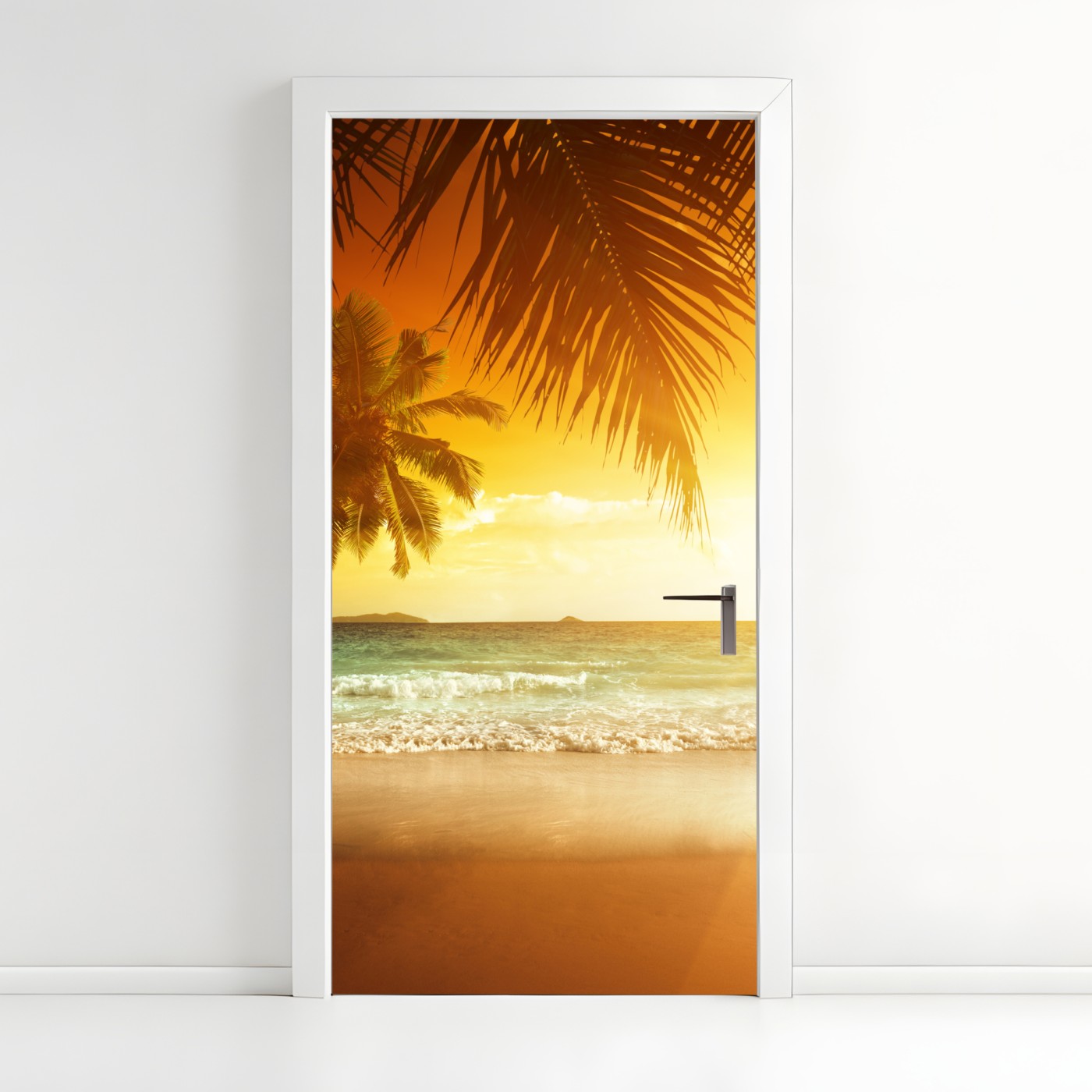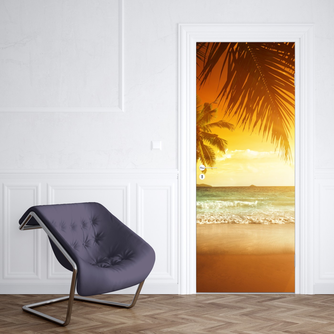 Türaufkleber Goldener sonnenuntergang an einem strand in der Karibik