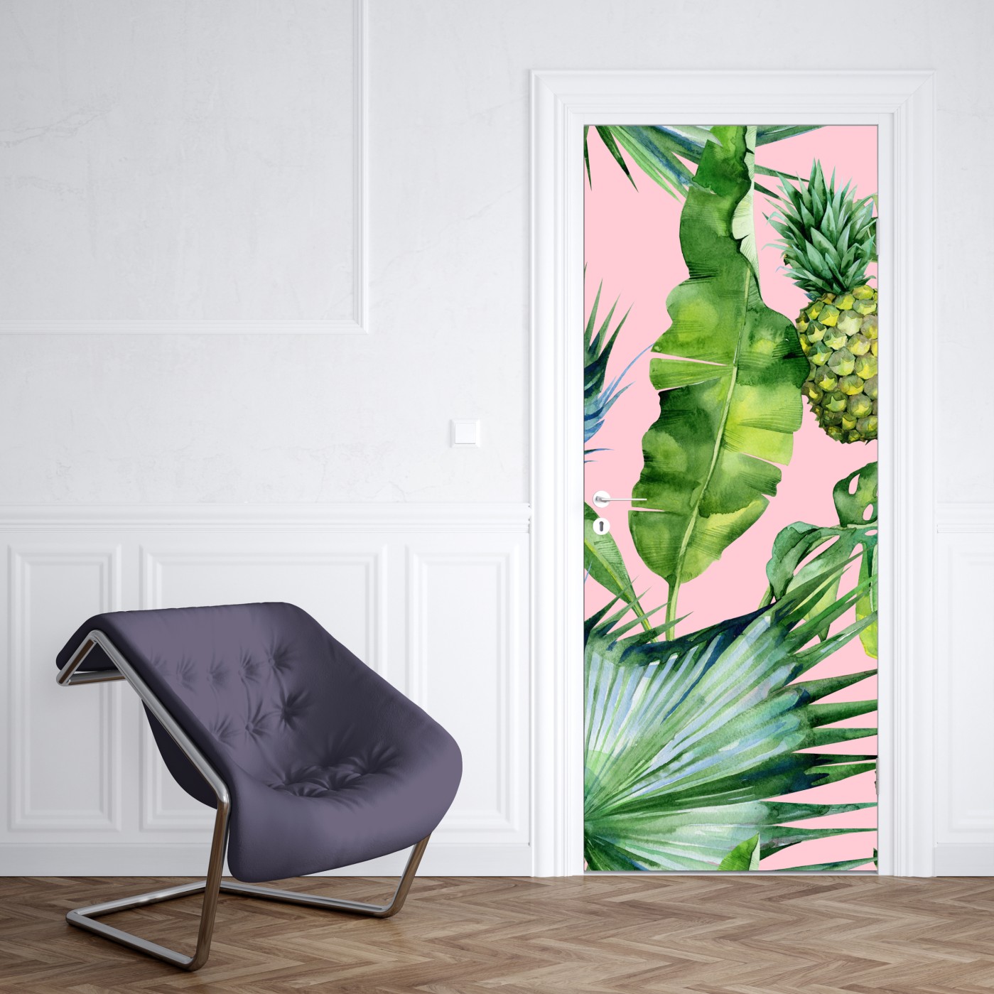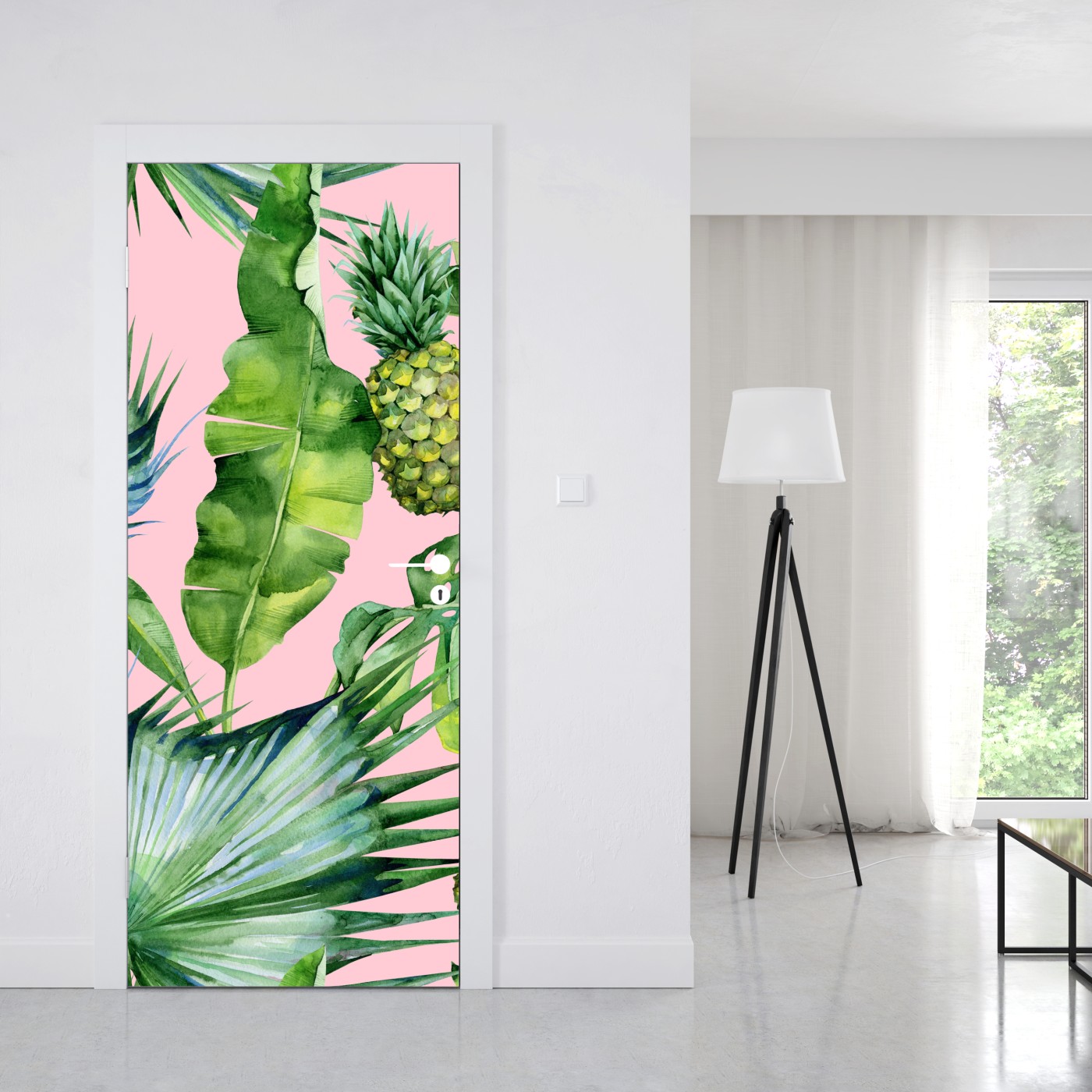 Türaufkleber Tropisches ananas- und blattmuster in aquarell auf rosa hintergrund