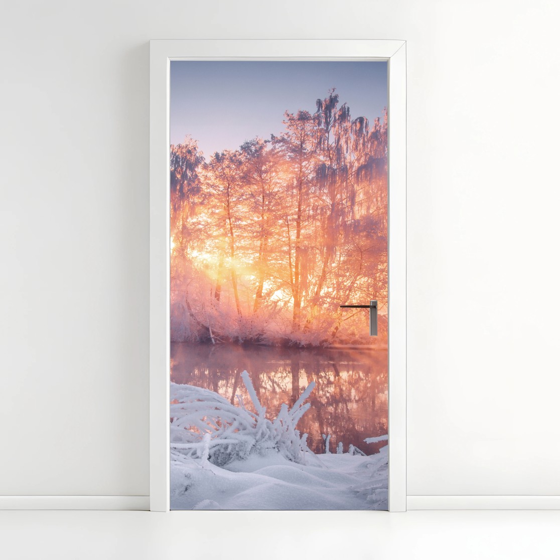 Türaufkleber Winterlicher sonnenaufgang über zugefrorenem fluss