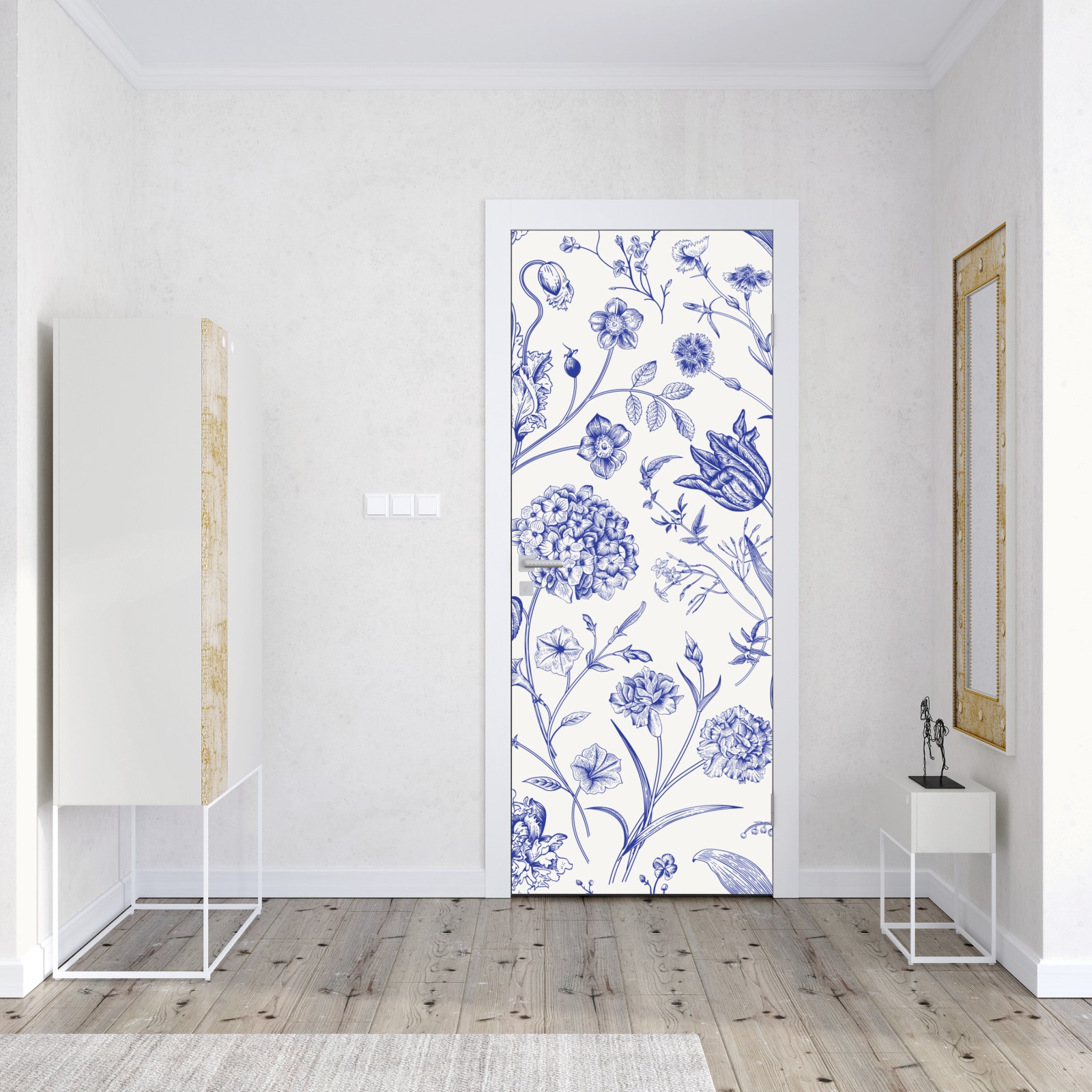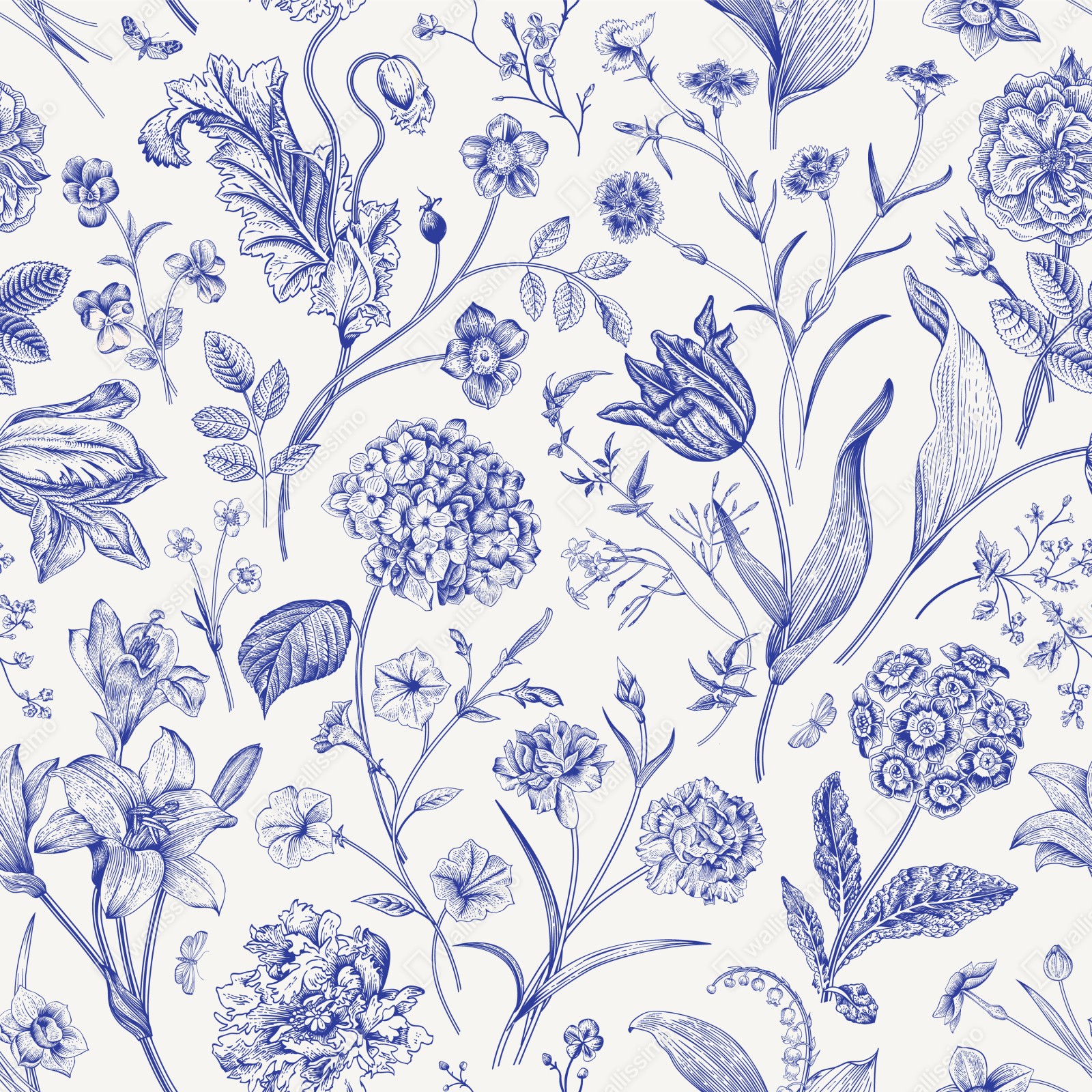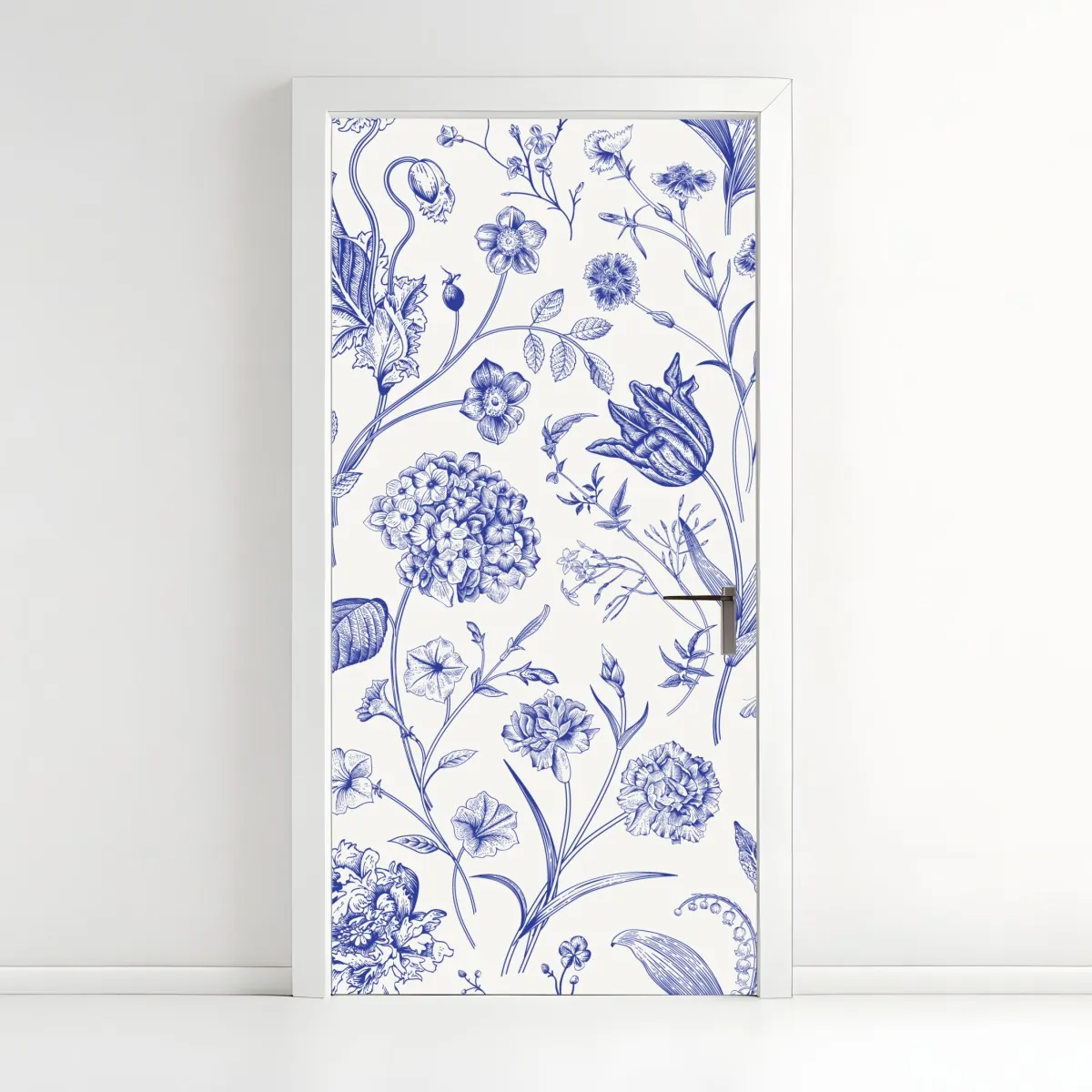Elegantes blau-weißes toile mit detaillierten botanischen Skizzen bringt zeitlosen Vintage-Charme ins Interieur.