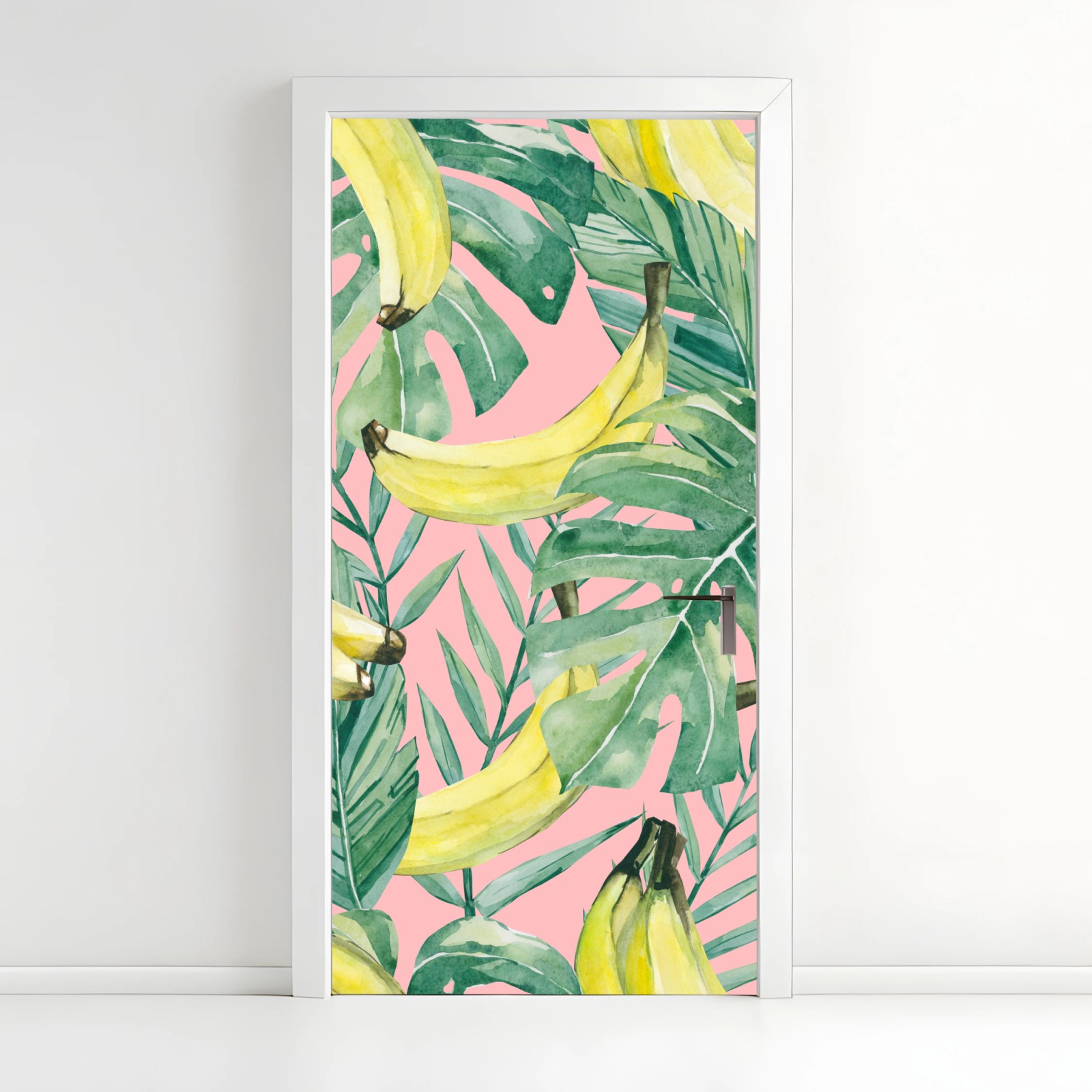 Türaufkleber Aquarell-bananen und blättermuster auf rosa hintergrund