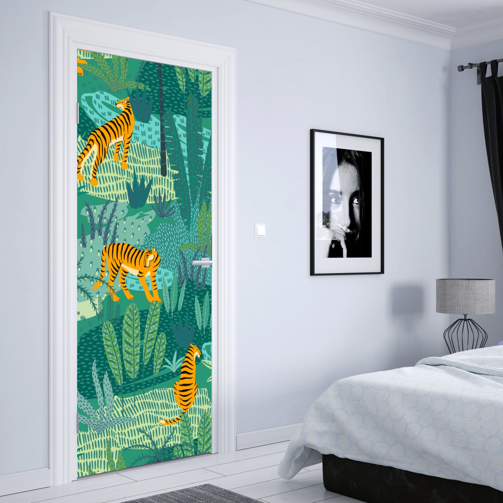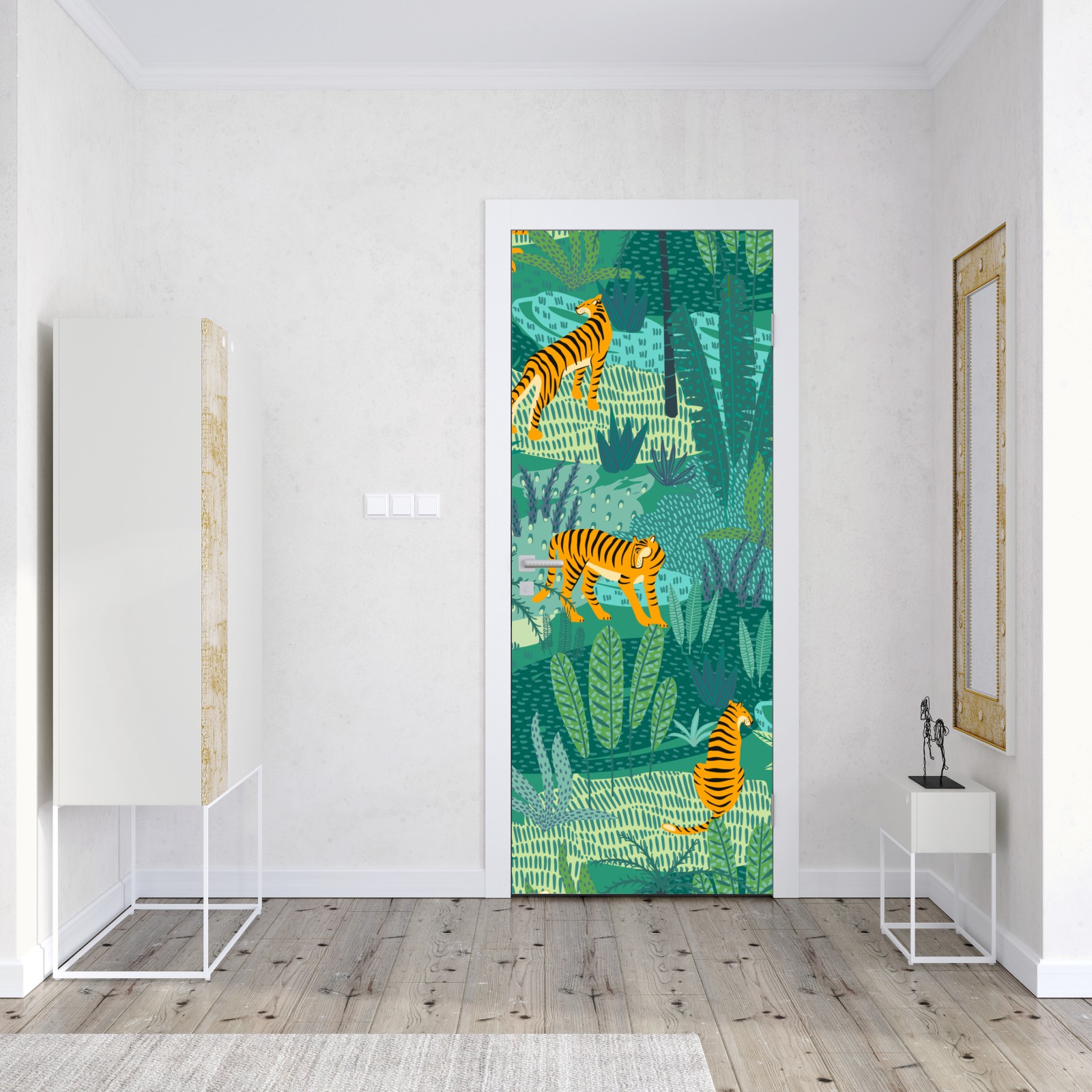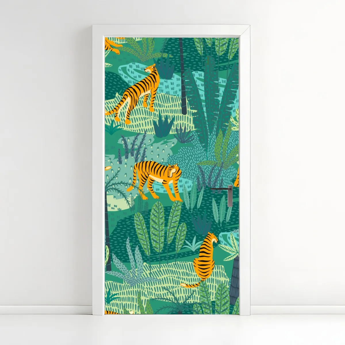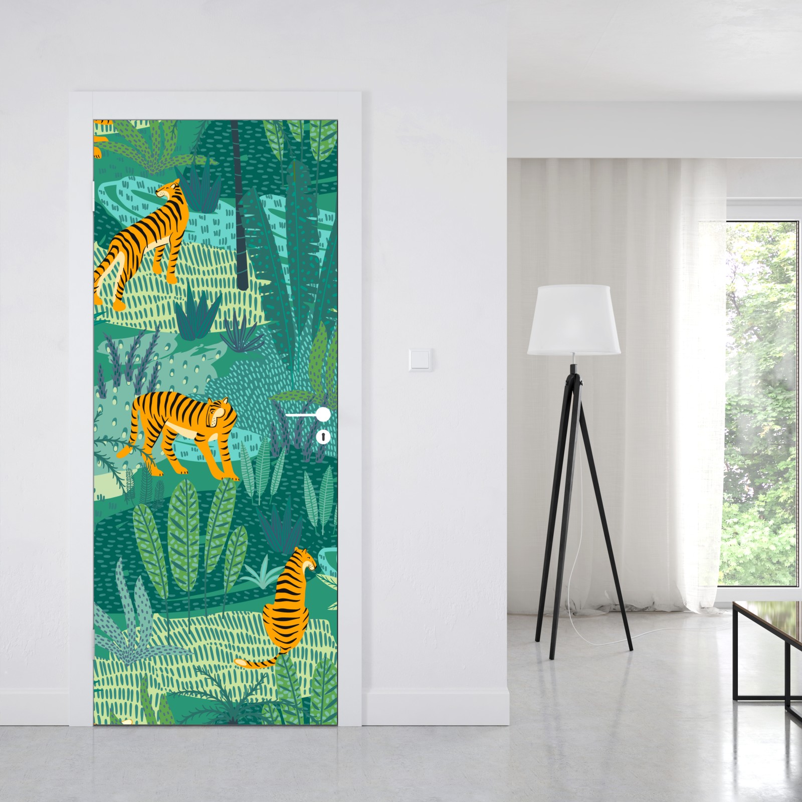 Lebendiges illustratives Muster mit Tigern und üppigem Blattwerk, ideal um Räumen einen natürlichen, fröhlichen Akzent zu verleihen.
