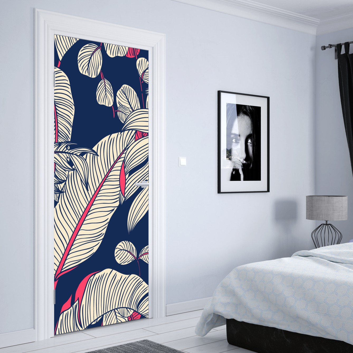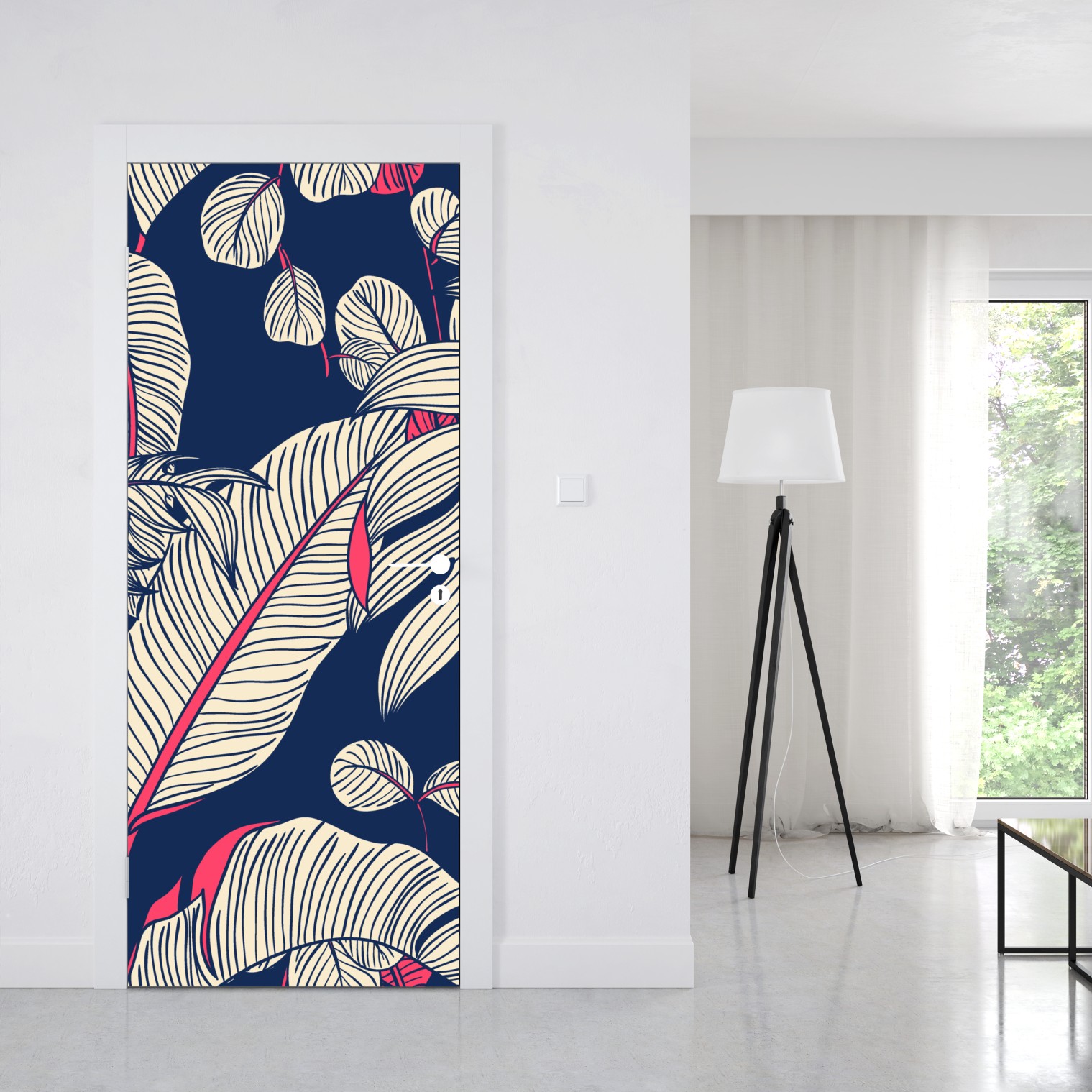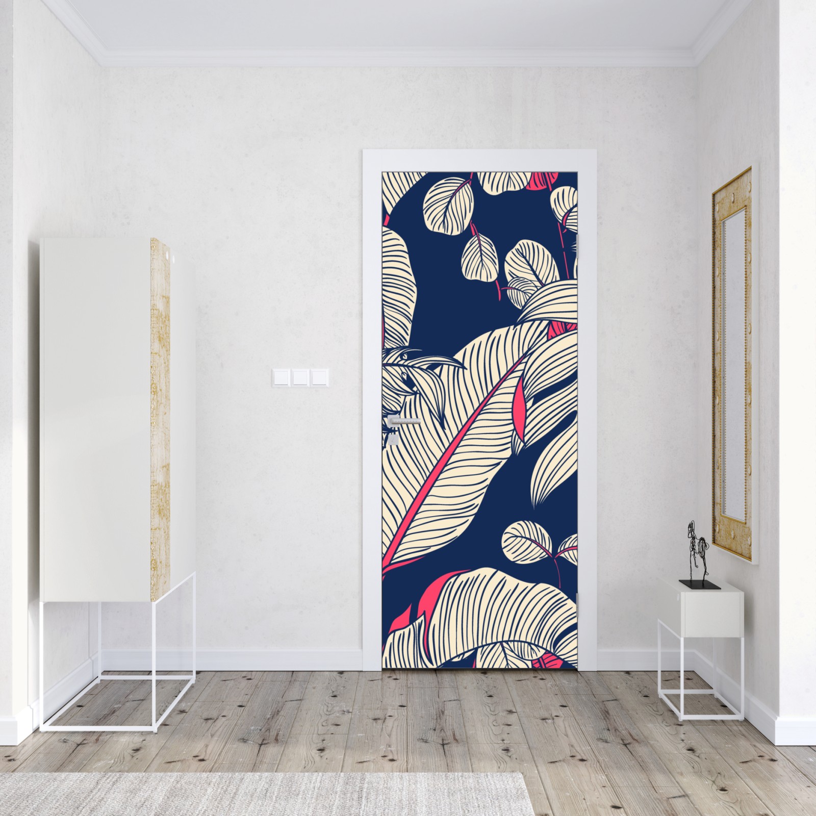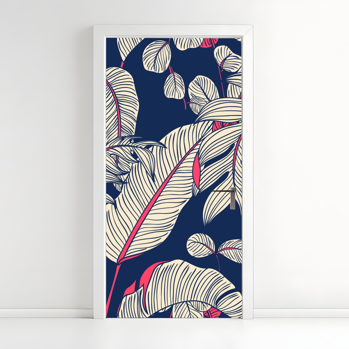 Kräftiges tropisches Blattmotiv in Marineblau, Creme und Rosa verleiht jedem Raum modernen botanischen Charme.