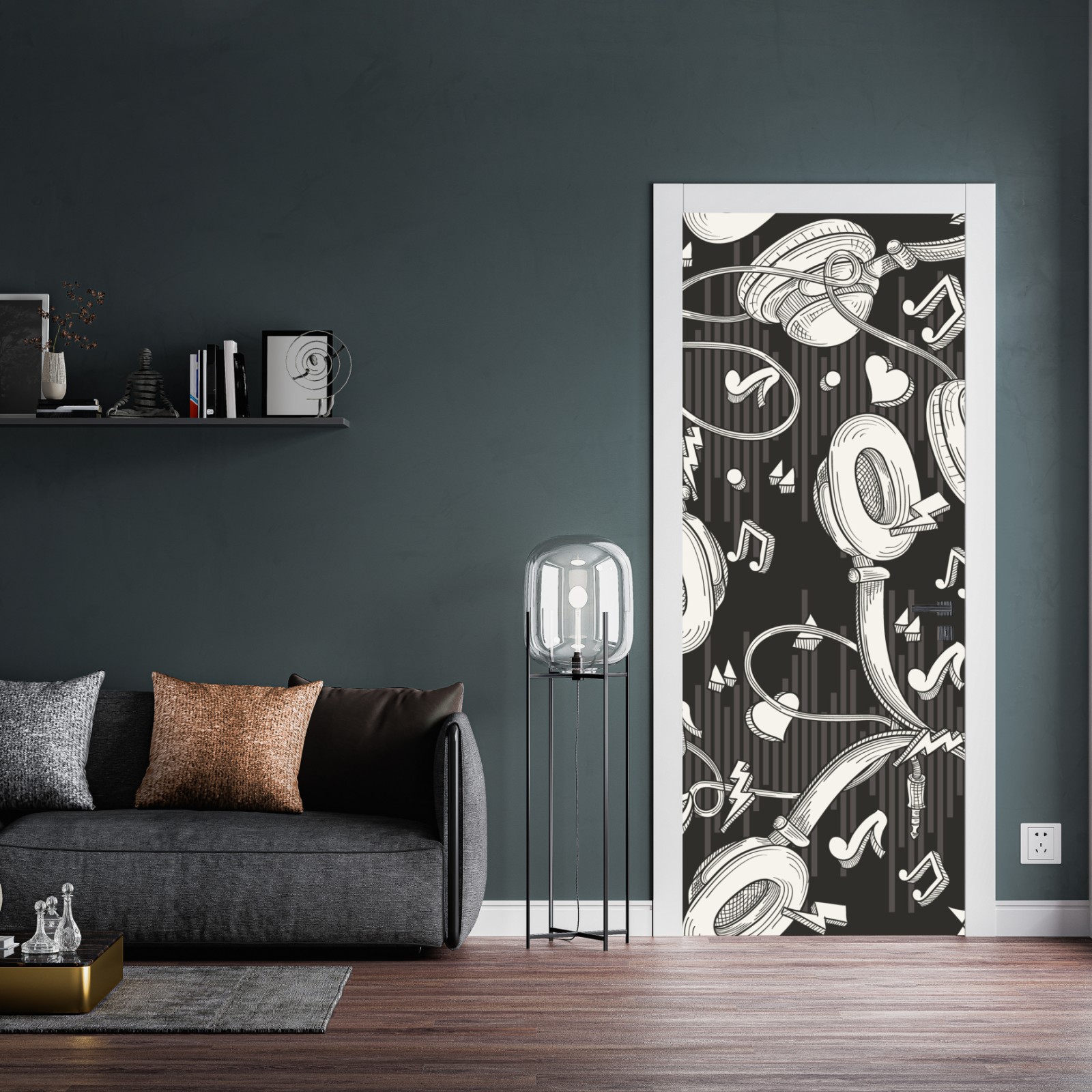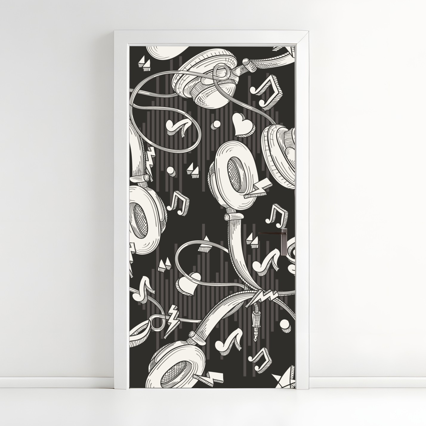 Türaufkleber monochromatisches muster mit kopfhörern und noten