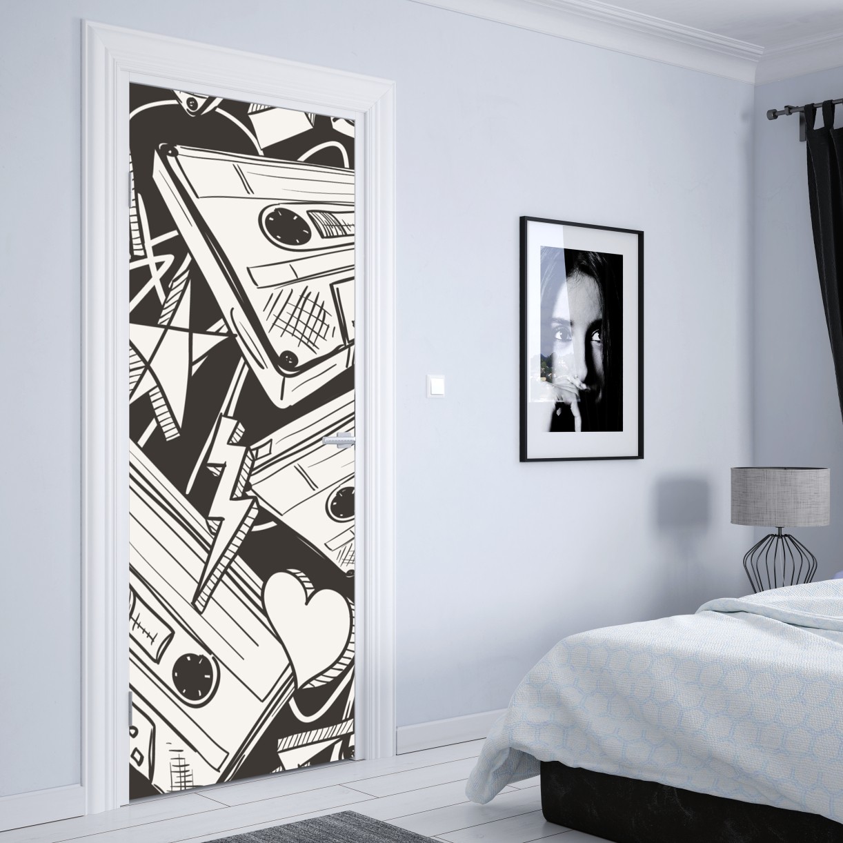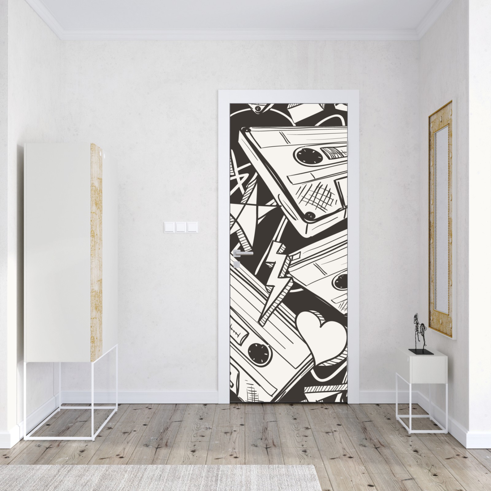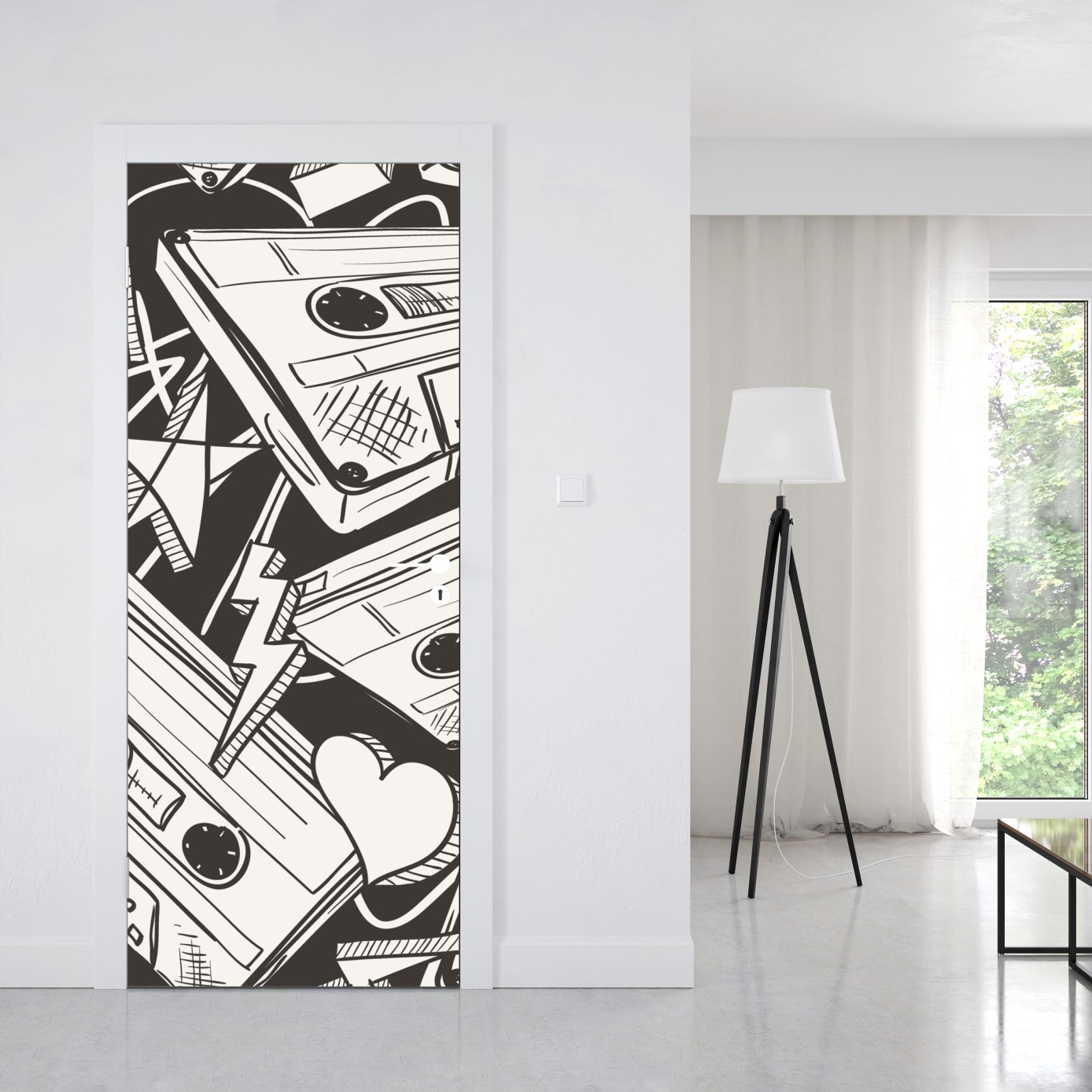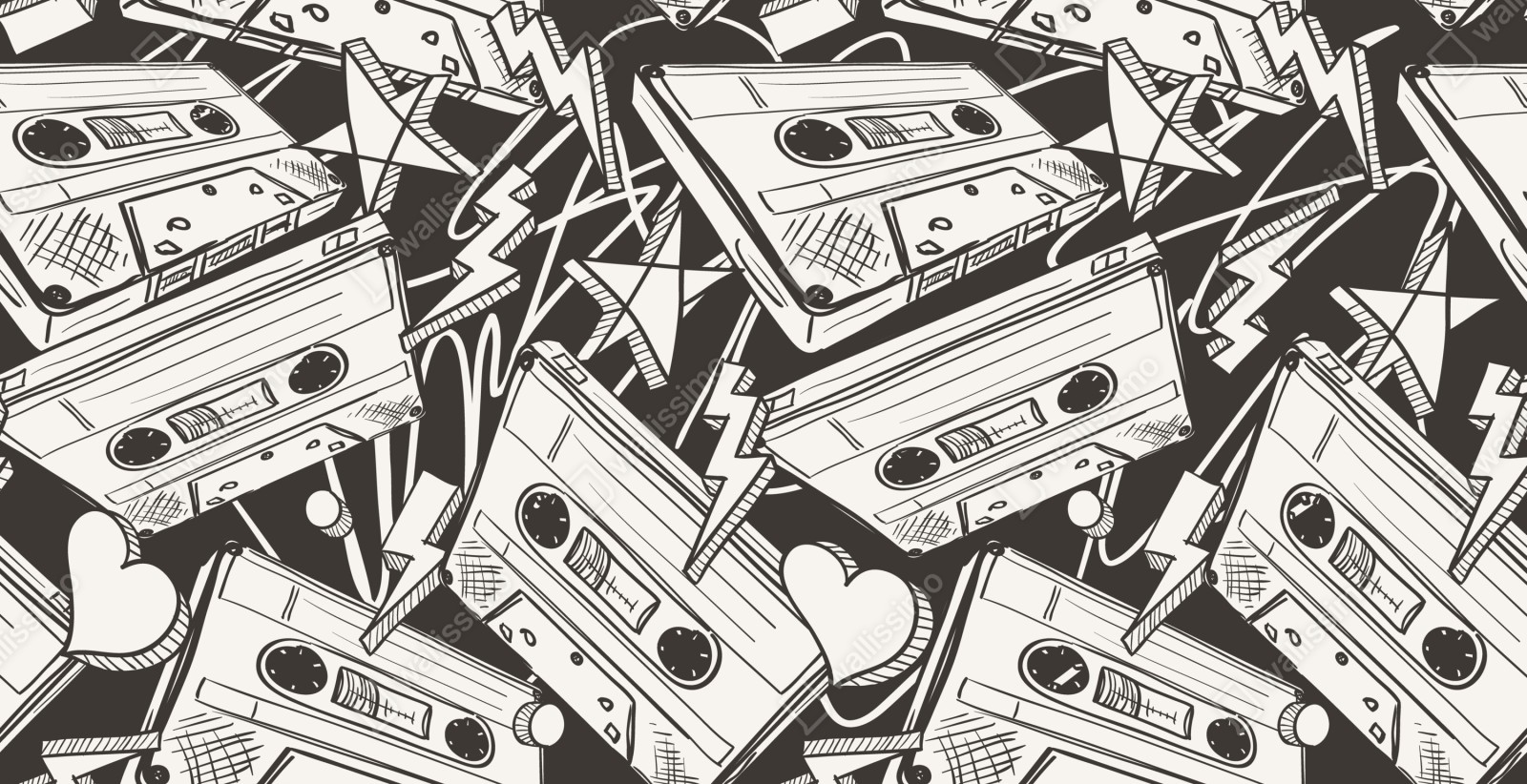 Markante monochrome Collage aus Vintage-Kassetten und verspielten Symbolen bringt Retro-Musik-Flair in jeden Raum.