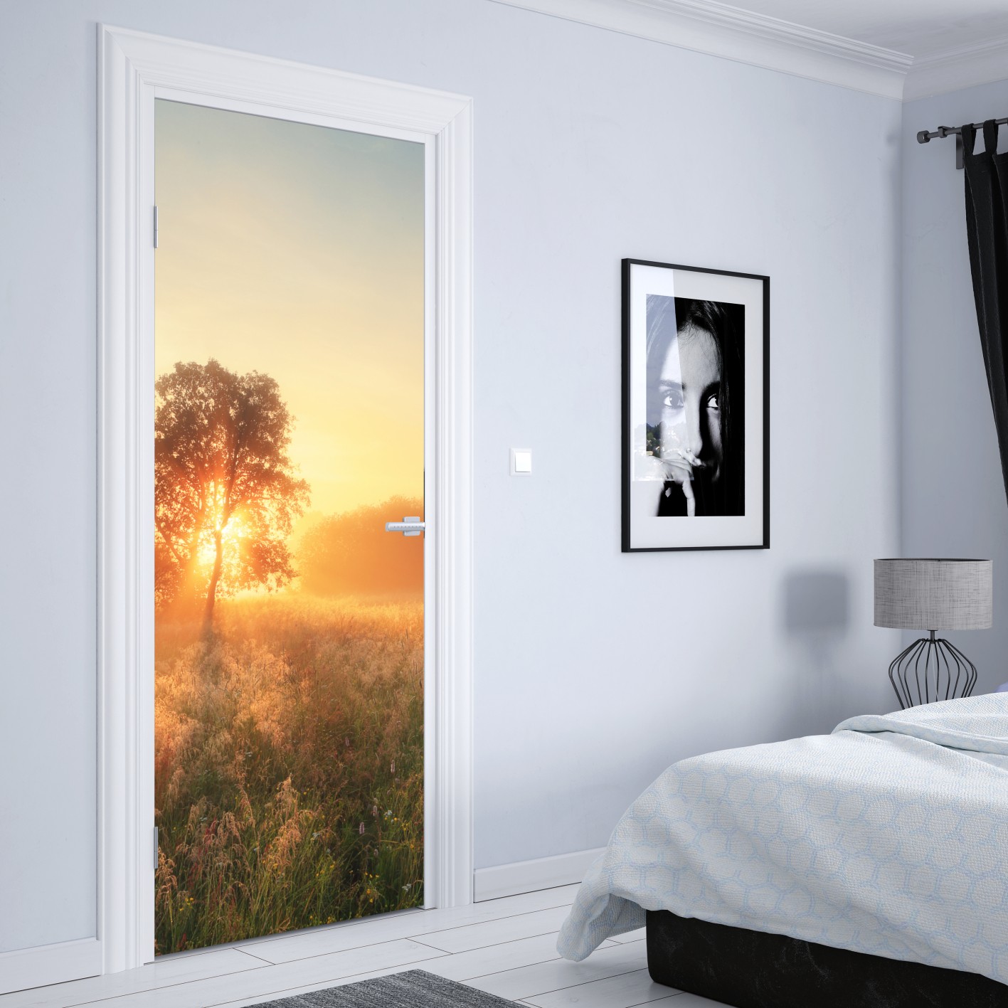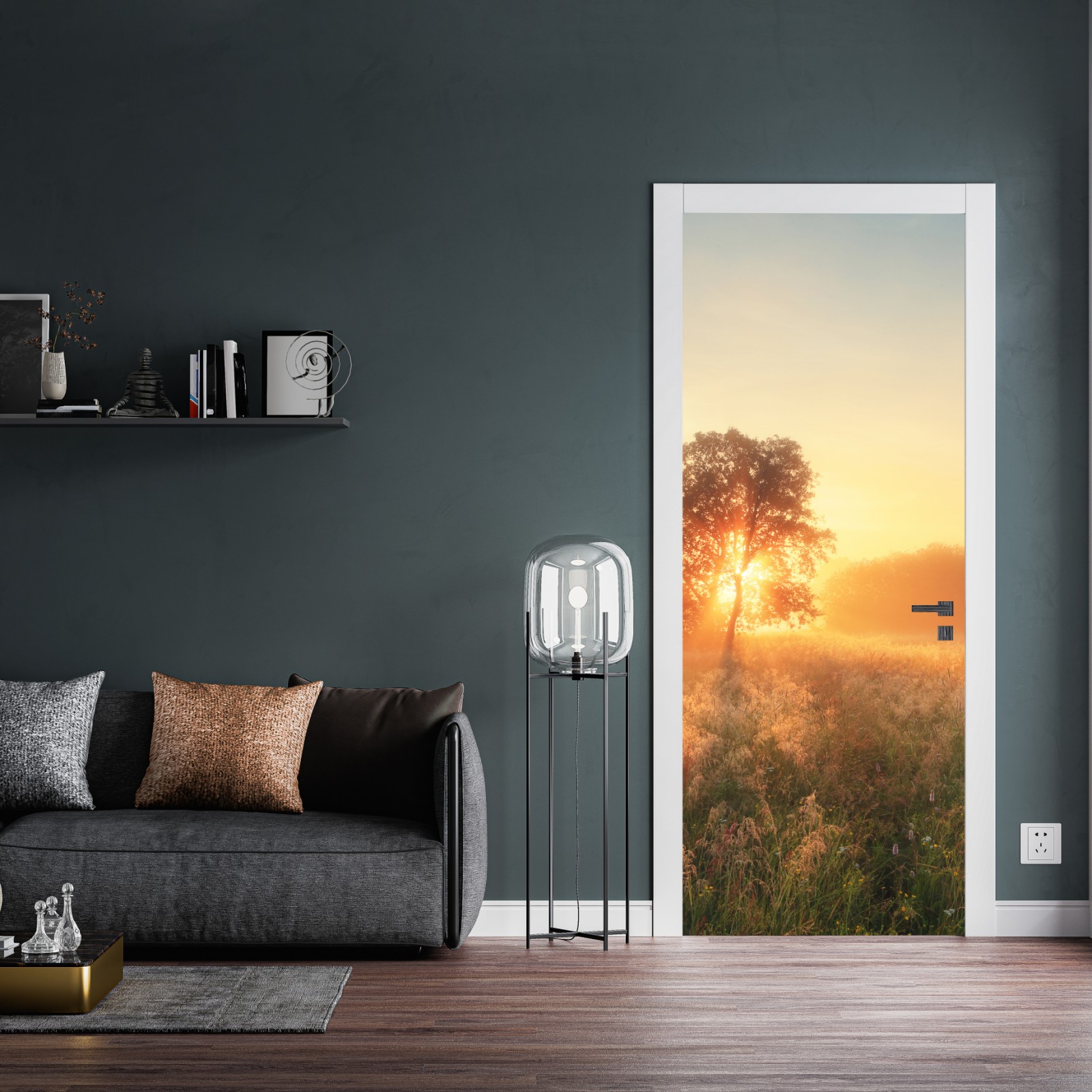 Türaufkleber goldener sonnenaufgang über nebliger wiese