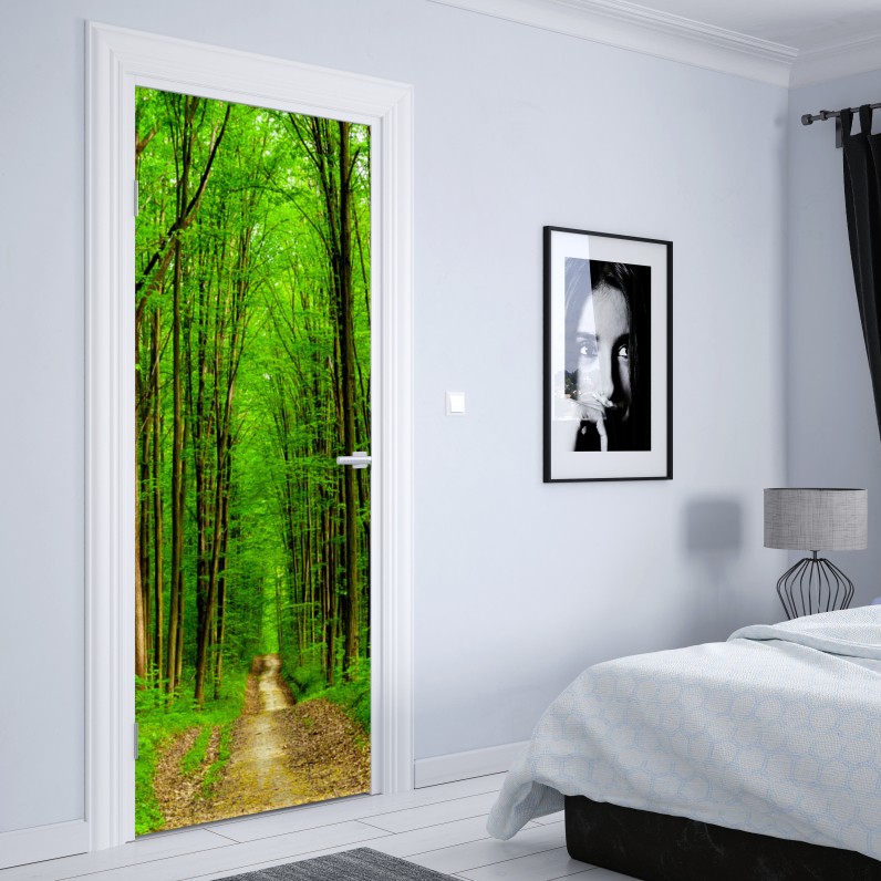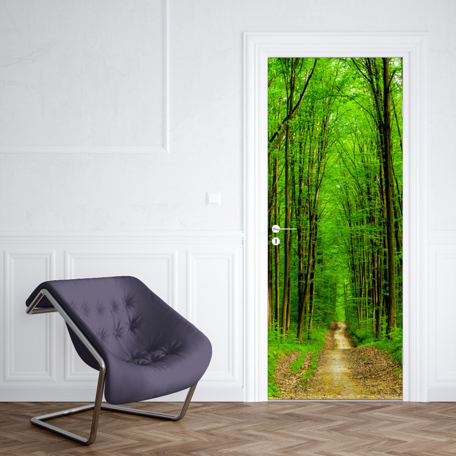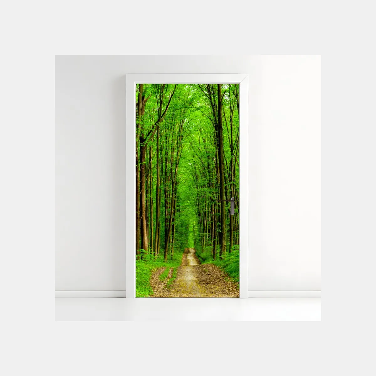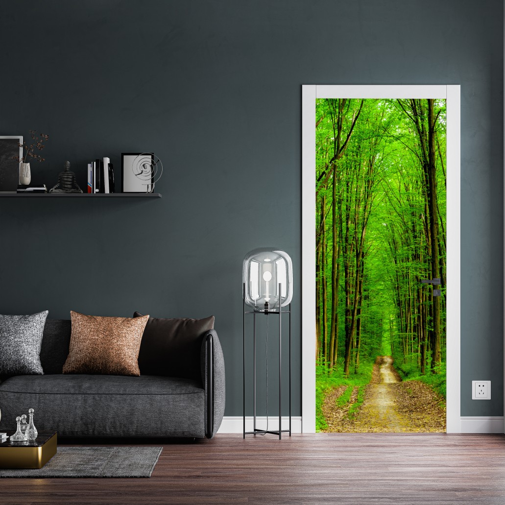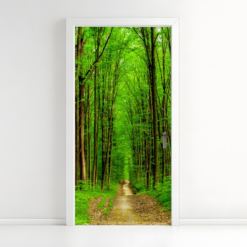 üppiger grüner waldweg im frühling, perfekt um die ruhe der natur in ihren raum zu bringen.