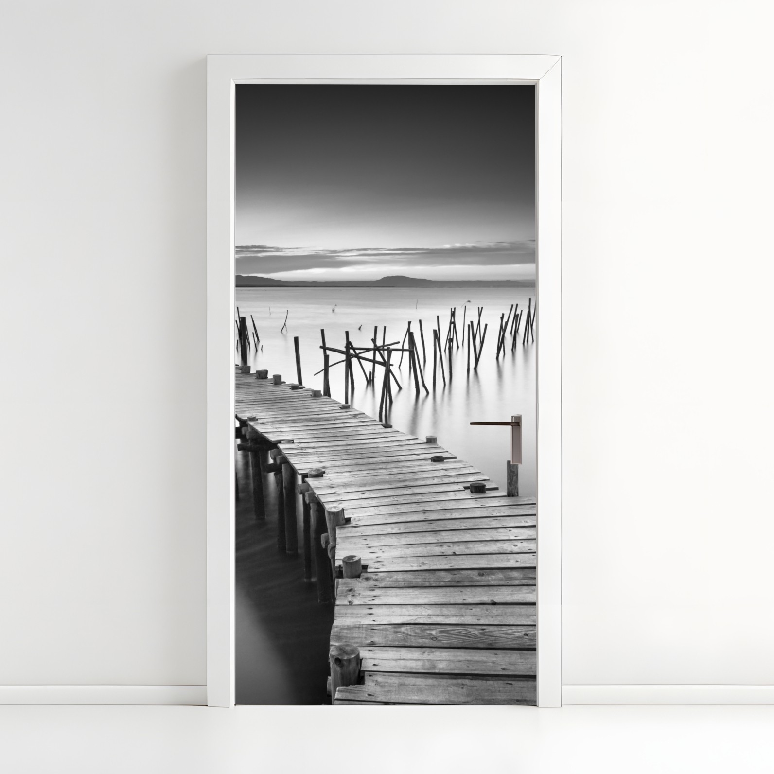 Minimalistische monochrome landschaft mit einem hölzernen steg über ruhigem wasser, die einen eleganten und reduzierten akzent im interieur setzt.