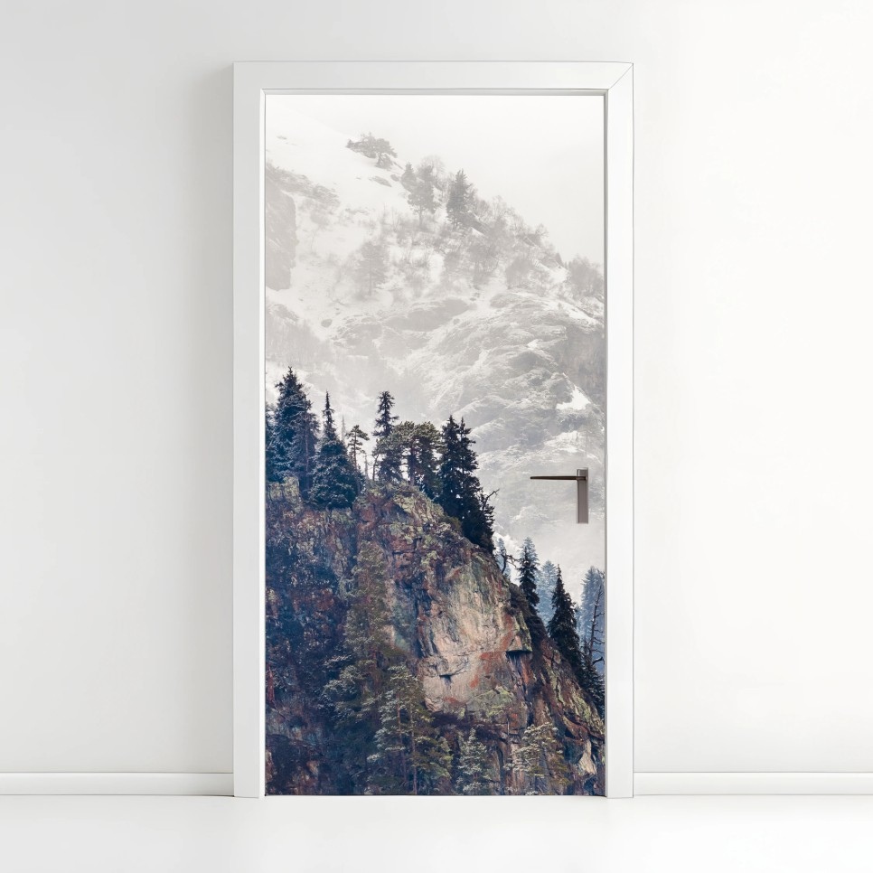 Türaufkleber Nebliger berg mit felsklippe und kieferwald