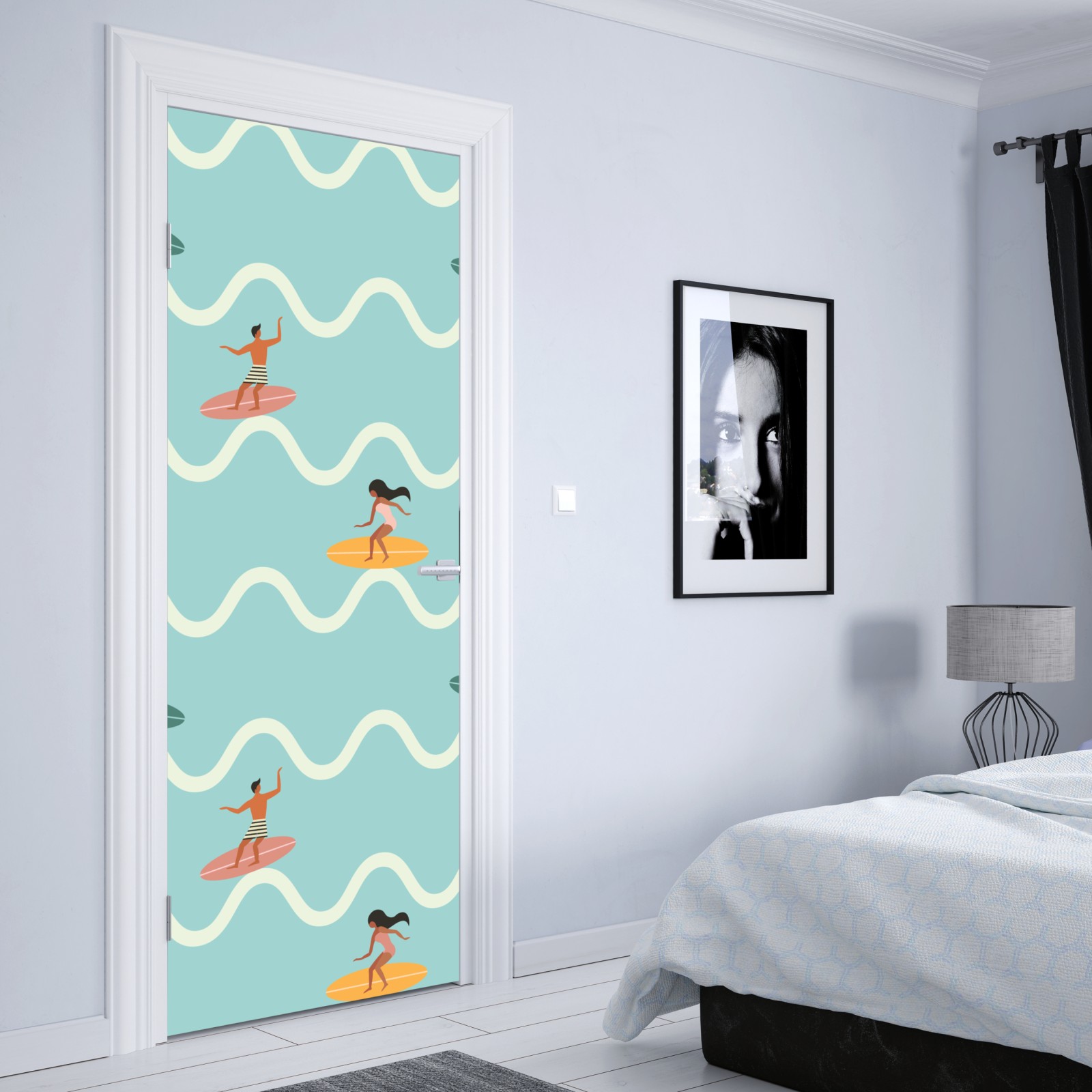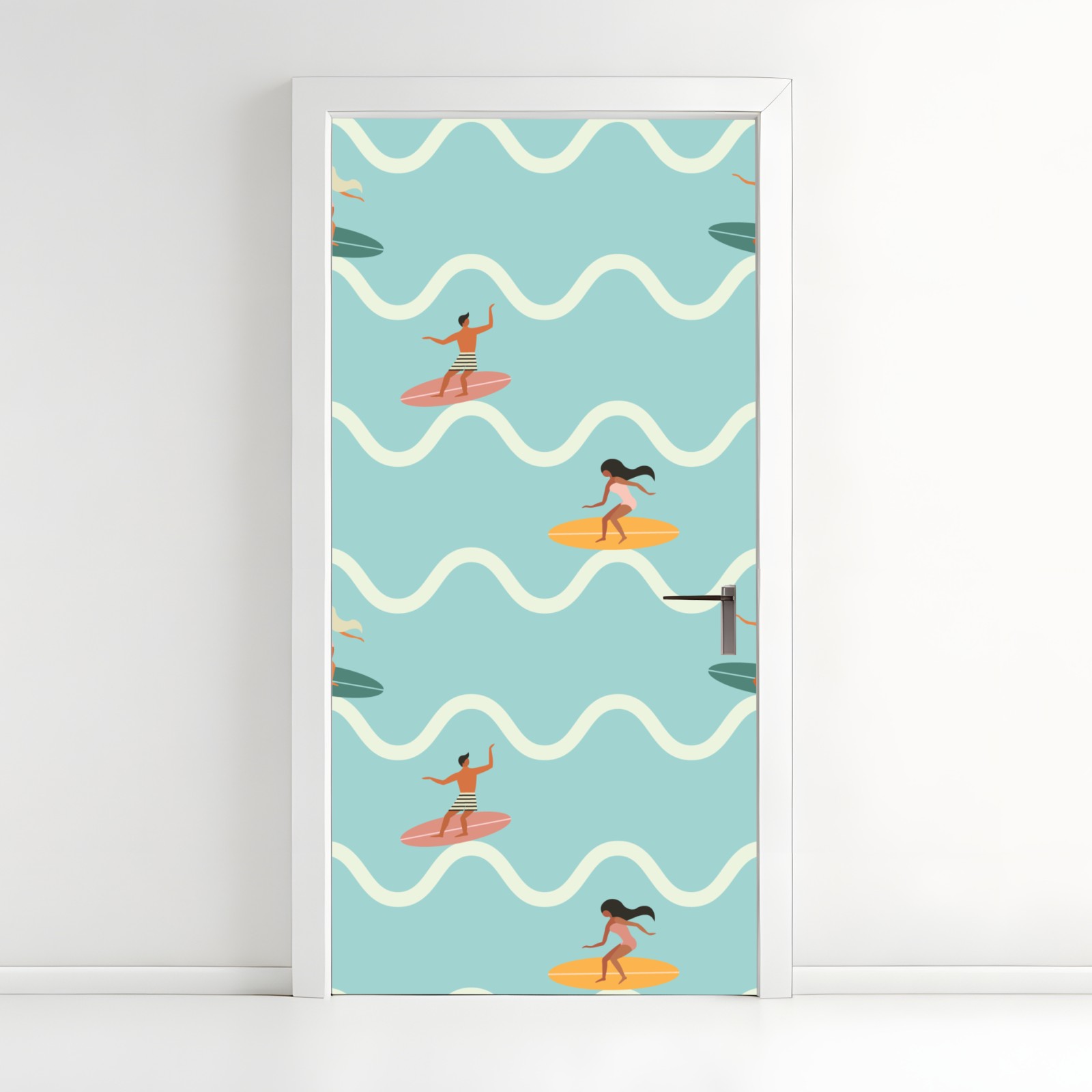 Türaufkleber surfer auf türkisfarbenen wellen