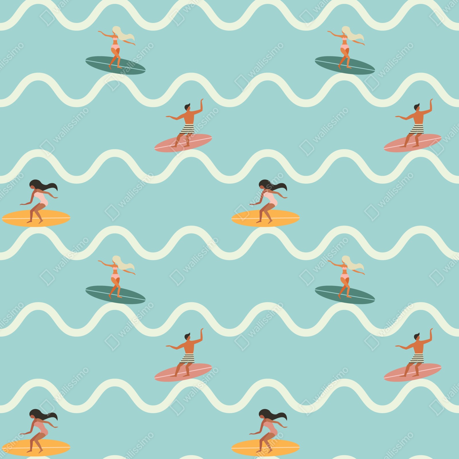 Lebhaftes, verspieltes Muster mit stilisierten Surfern auf türkisfarbenen Wellen, ideal für sommerliche Dekorationen und Kinderzimmer.