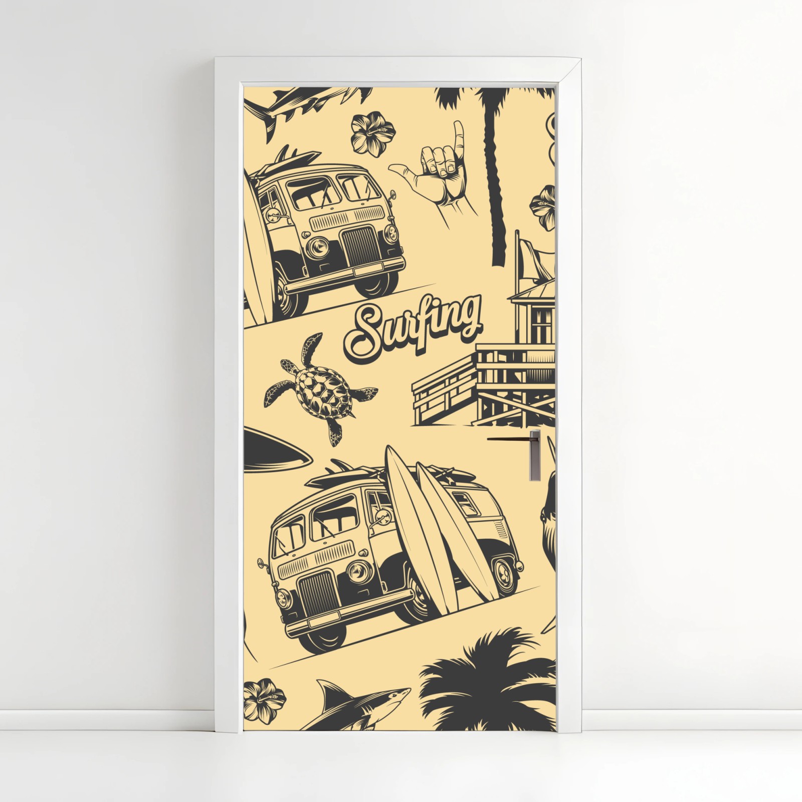 Türaufkleber Retro surfing muster mit campingbus und wellen