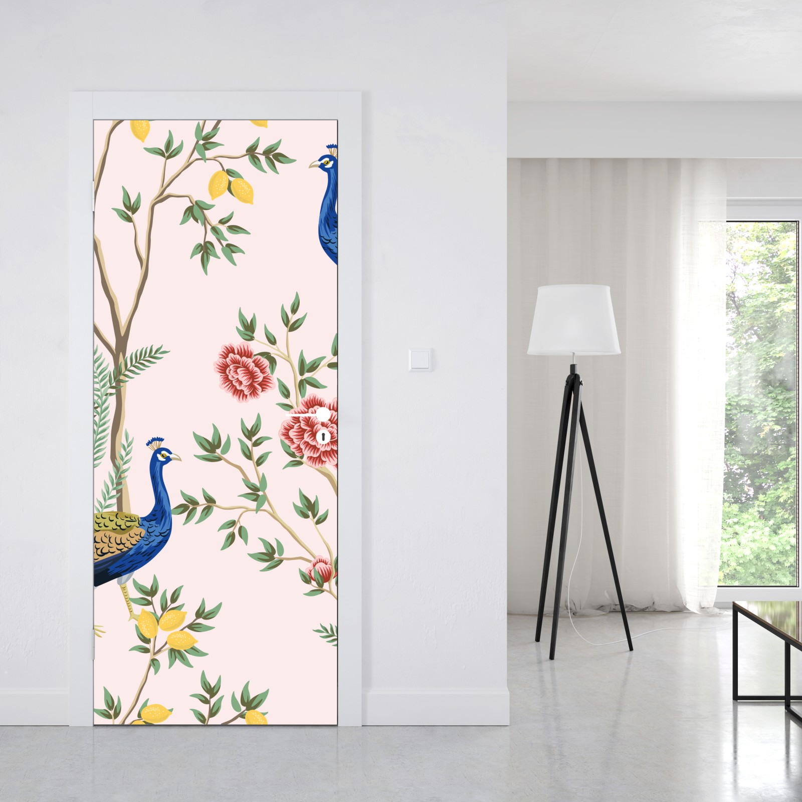 Türaufkleber elegantes pfau- und blumenmuster auf rosa hintergrund