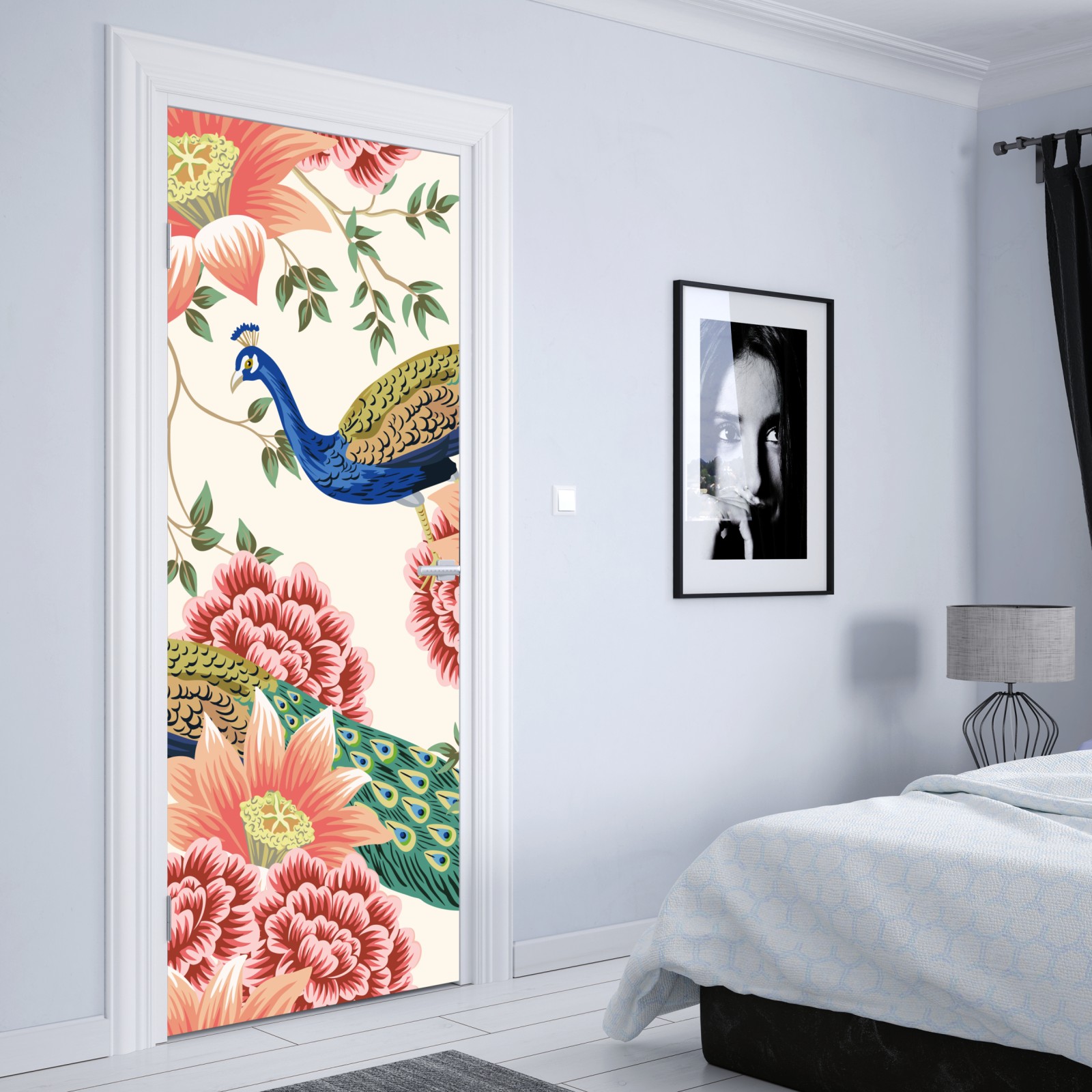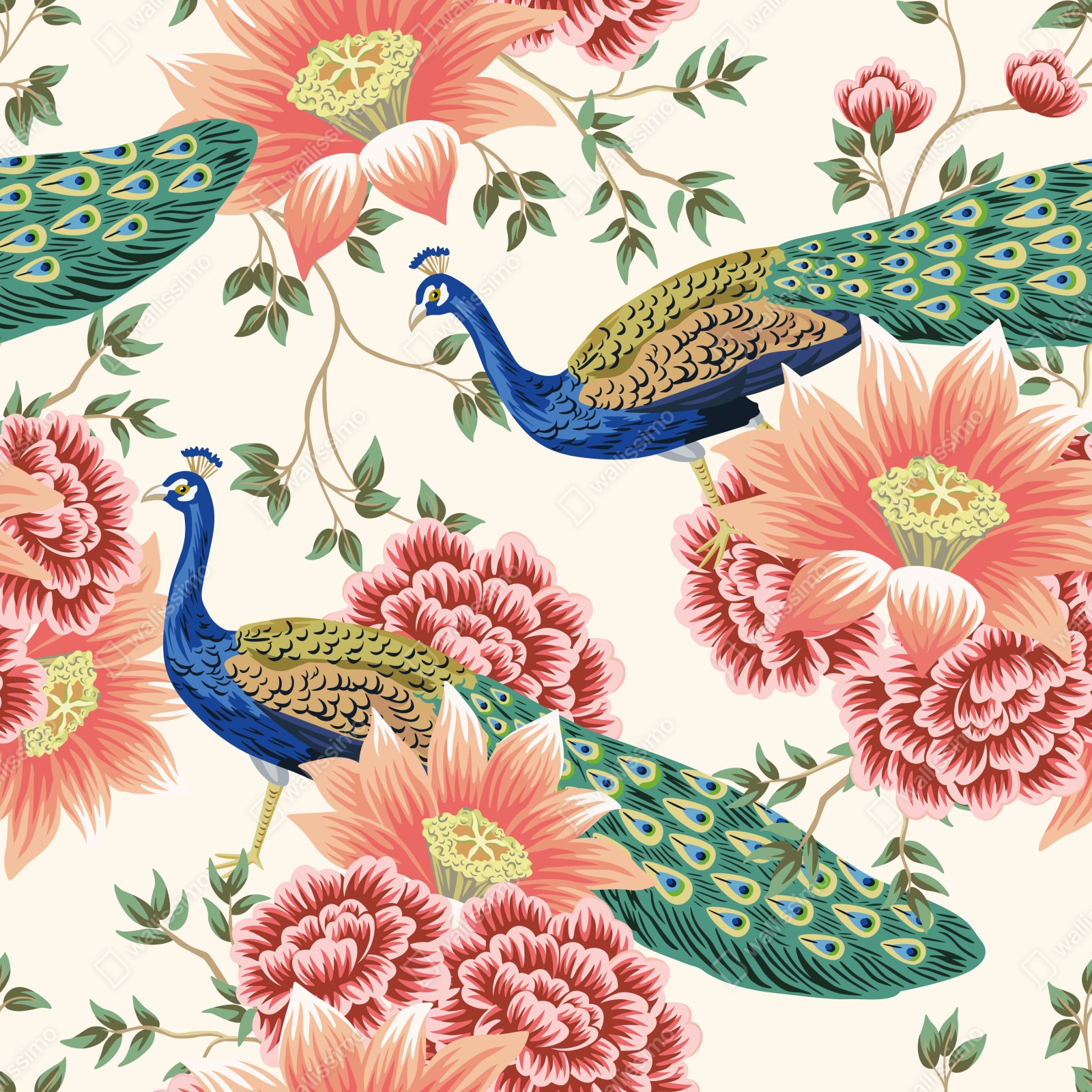 Pastellfarbene Pfauen und üppige Blüten schaffen ein elegantes, naturinspiriertes Muster, das jedem Raum raffinierte Wärme verleiht.