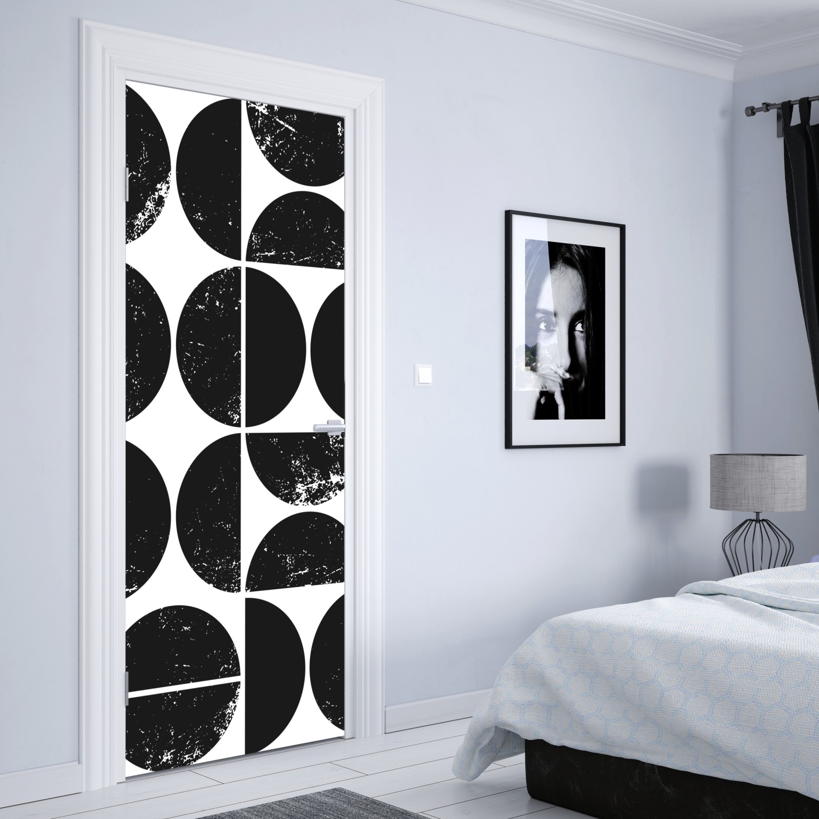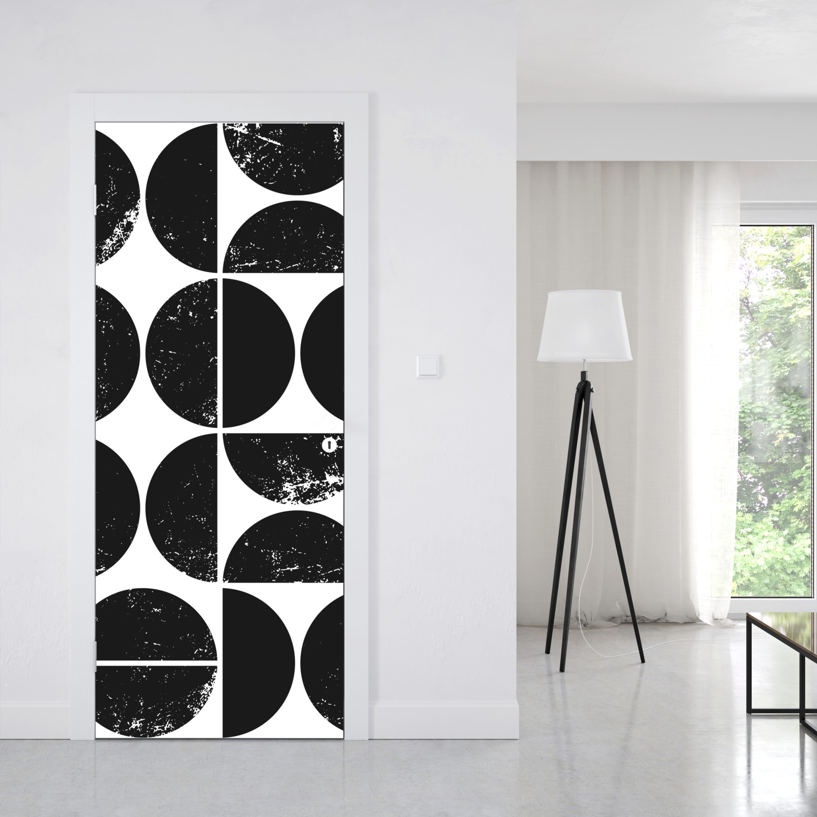 Kräftige schwarze Kreise mit verwitterter Textur schaffen ein modernes, minimalistisches Wandmotiv.