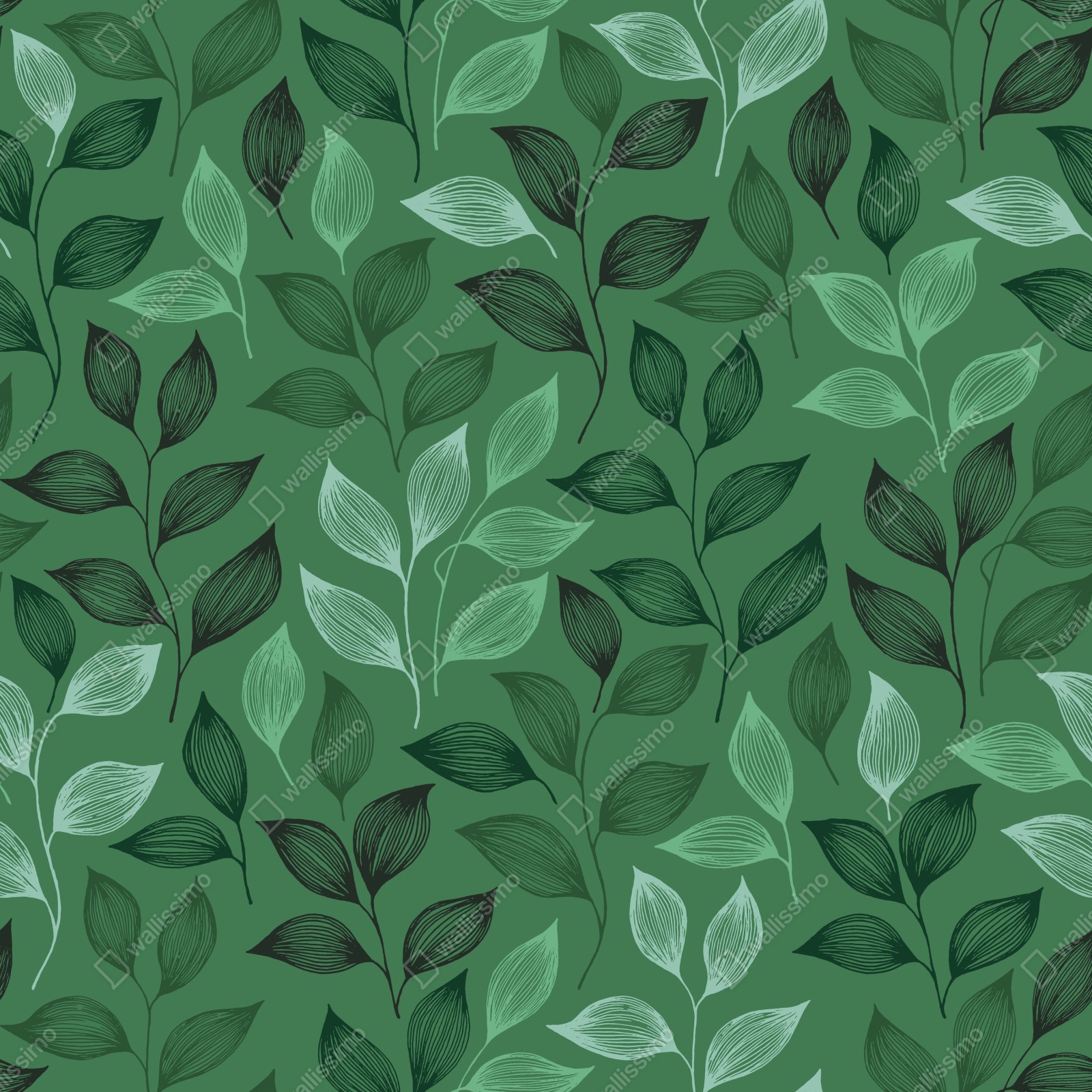 Elegantes grünes botanisches Muster mit handgezeichneten Blättern in verschiedenen Grüntönen, ideal um natürliche Ruhe in jedes Interieur zu bringen.
