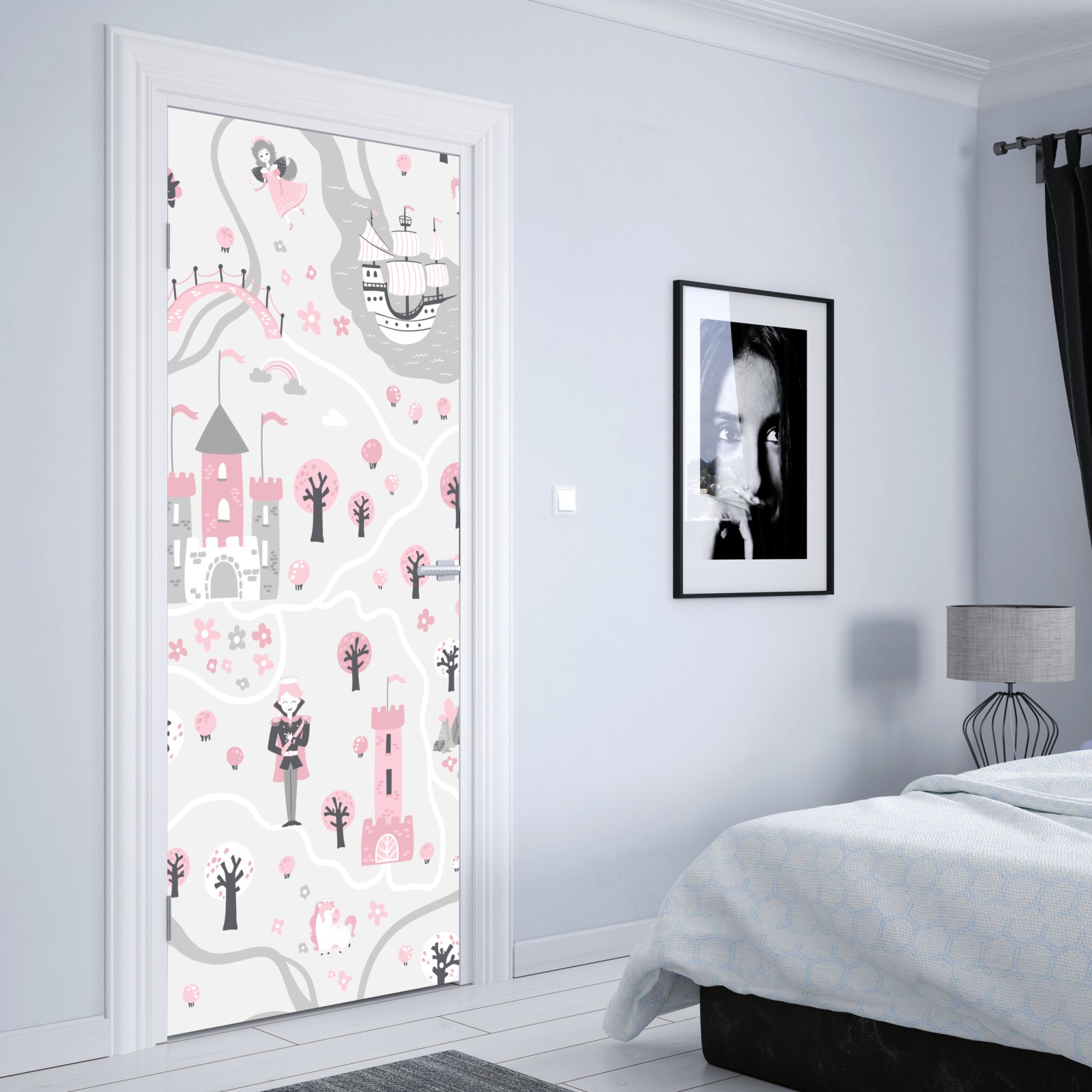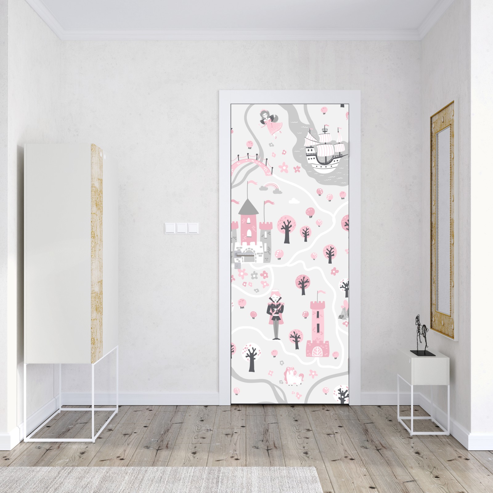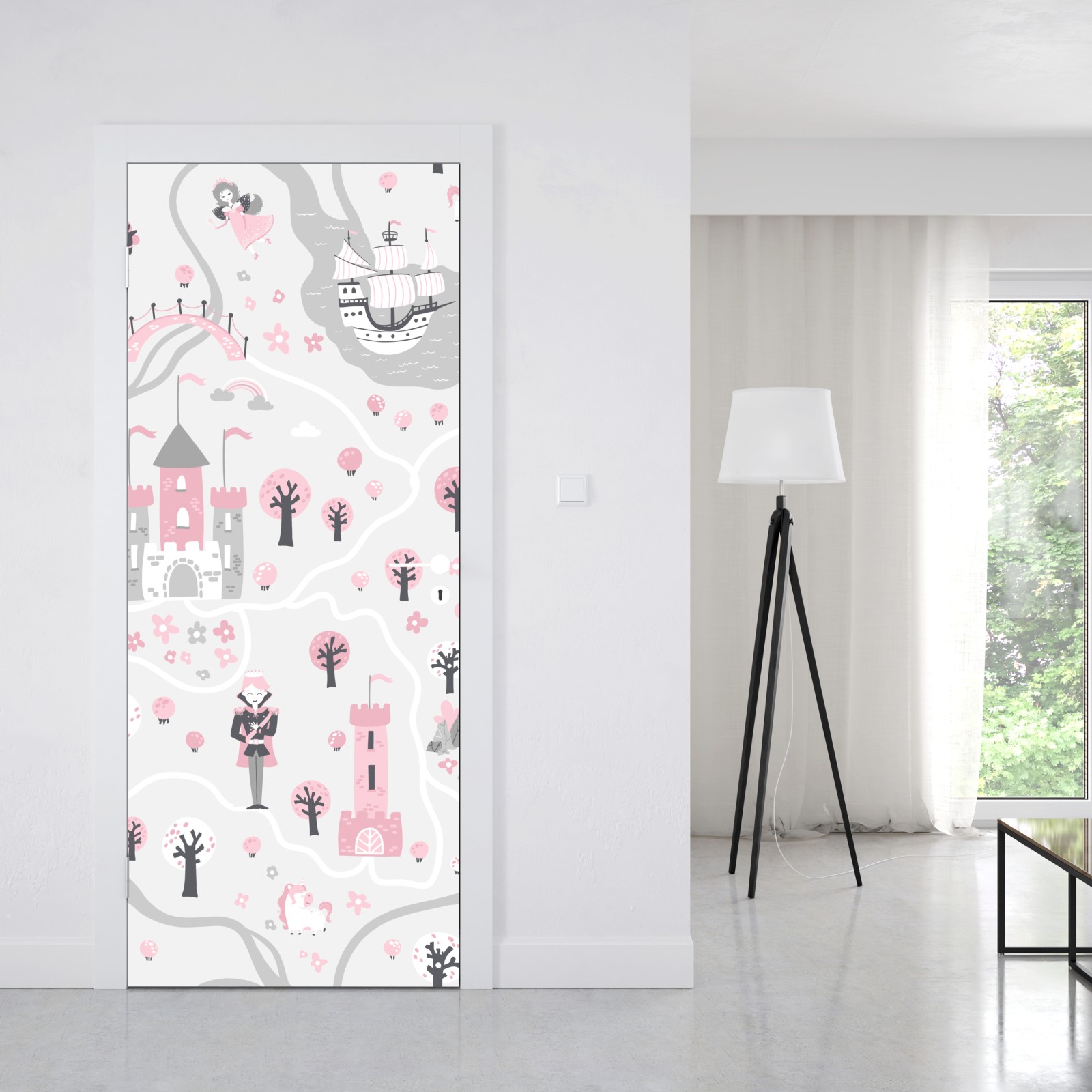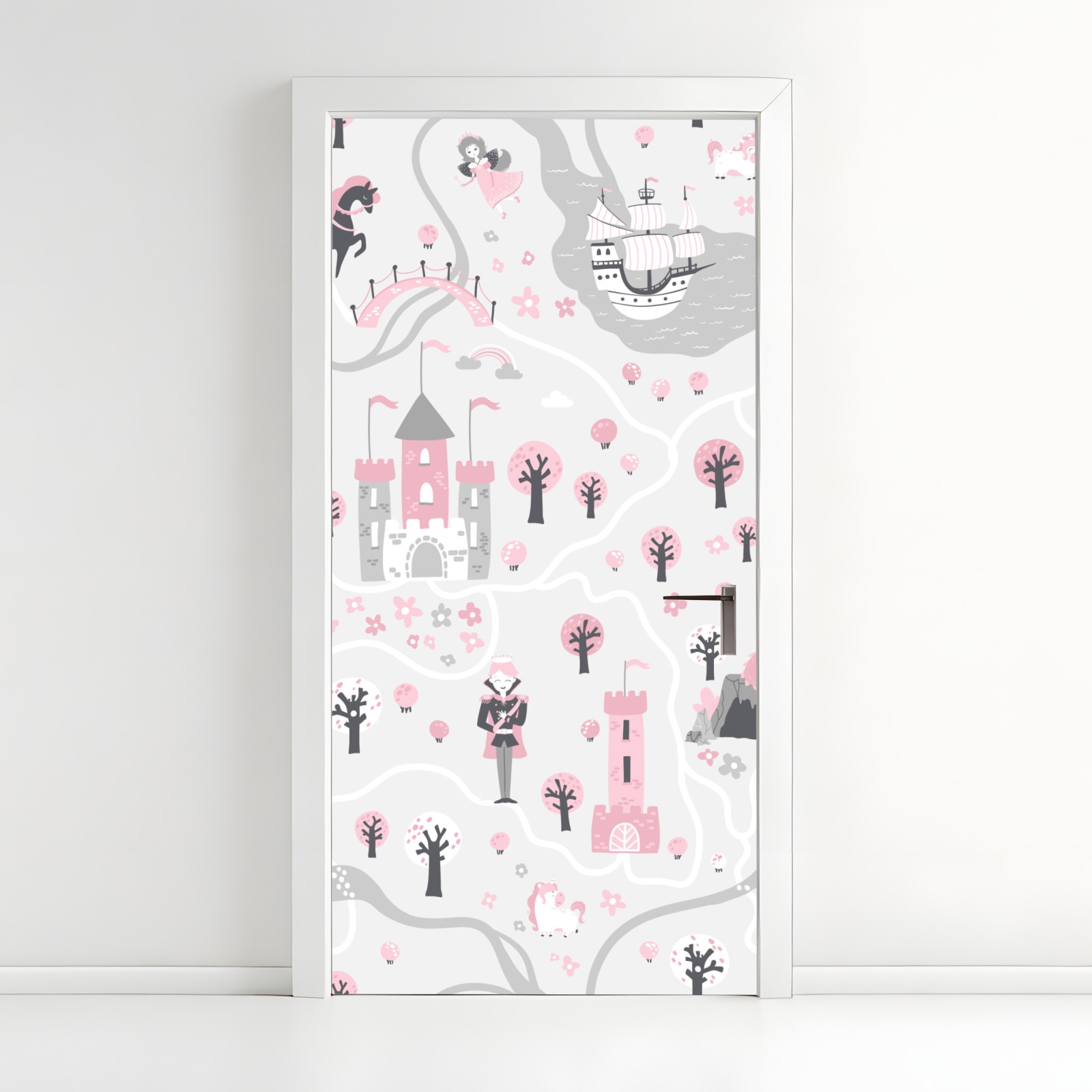 zauberhafte pastell-märchenkarte mit schlössern, drachen und prinzessinnen, perfekt fürs kinderzimmer.