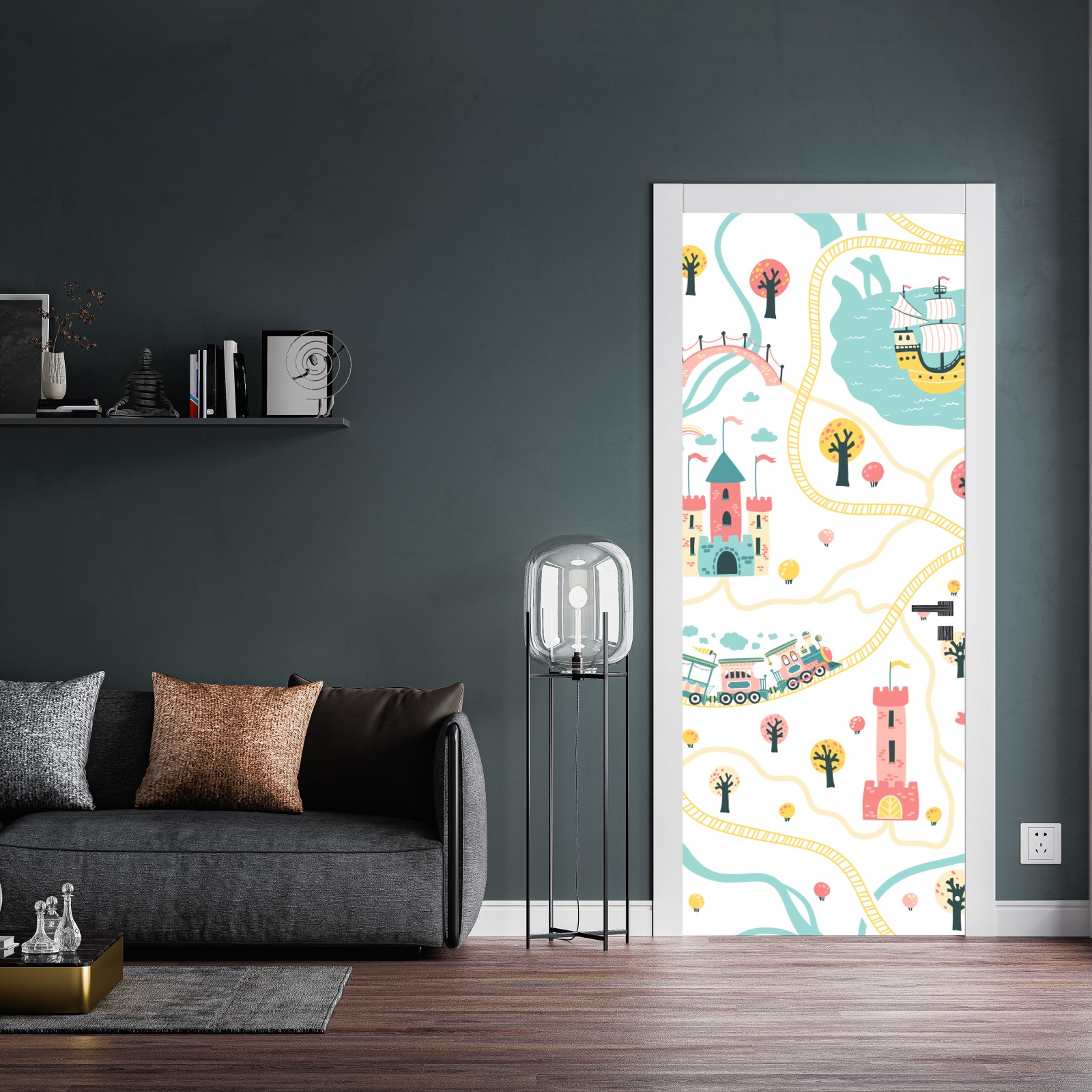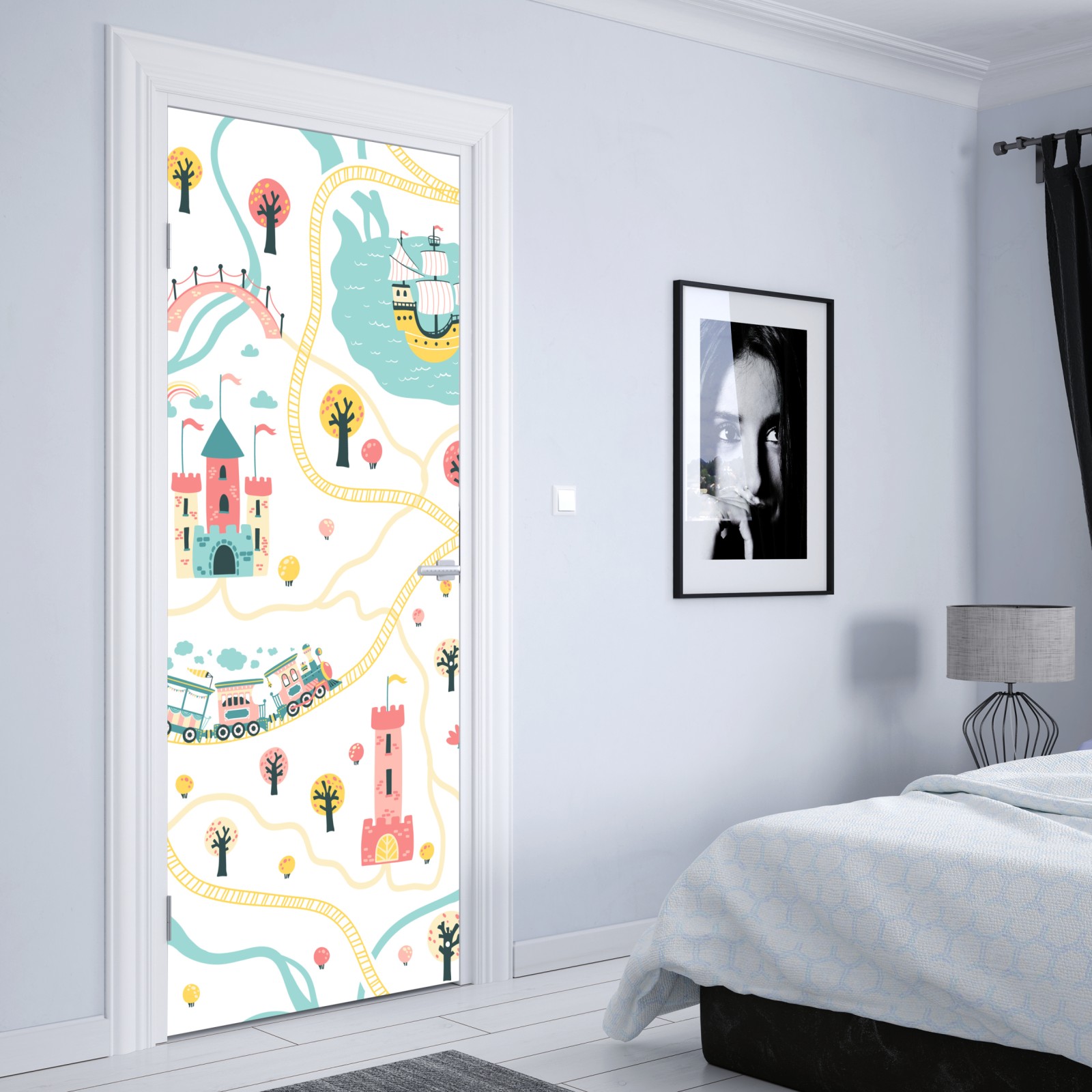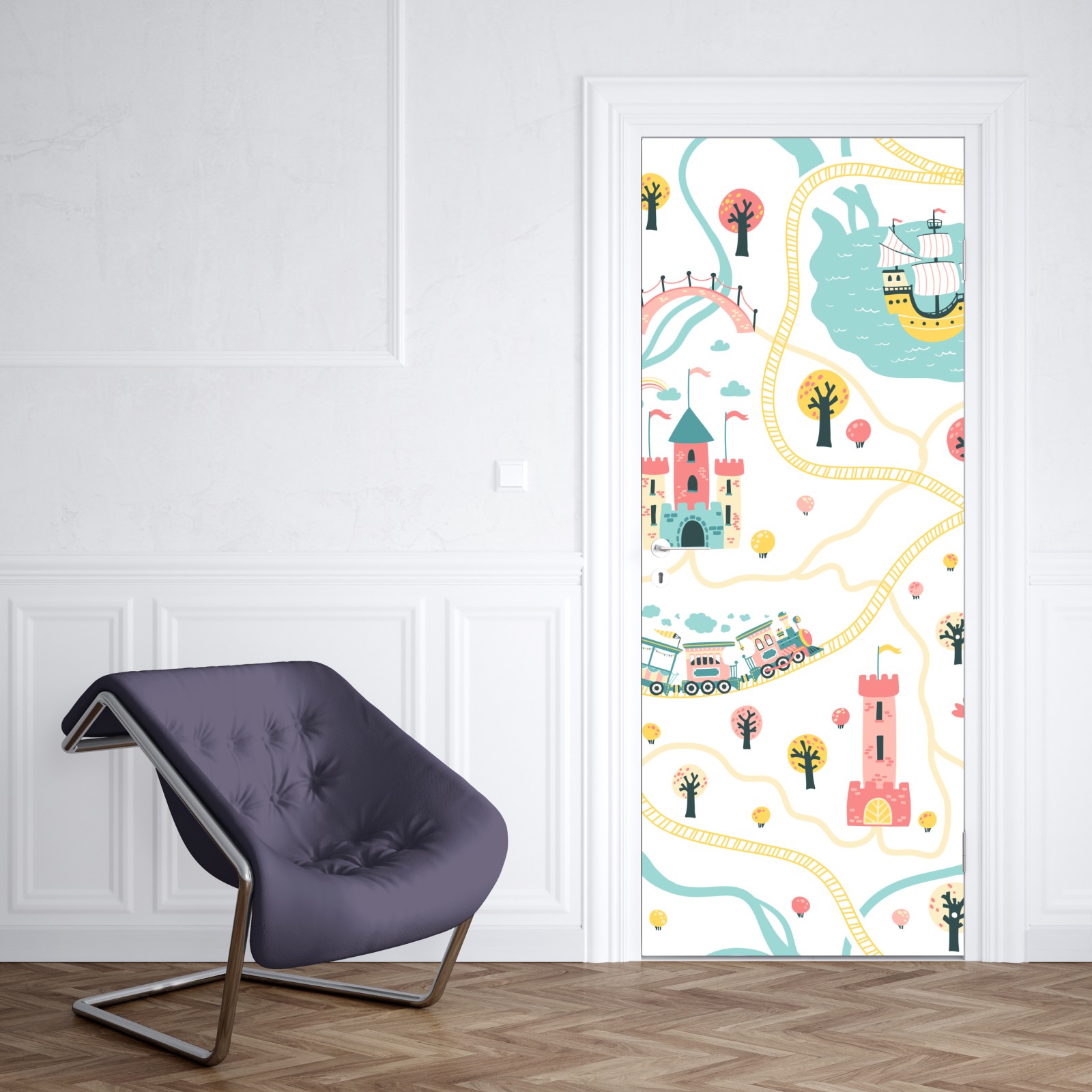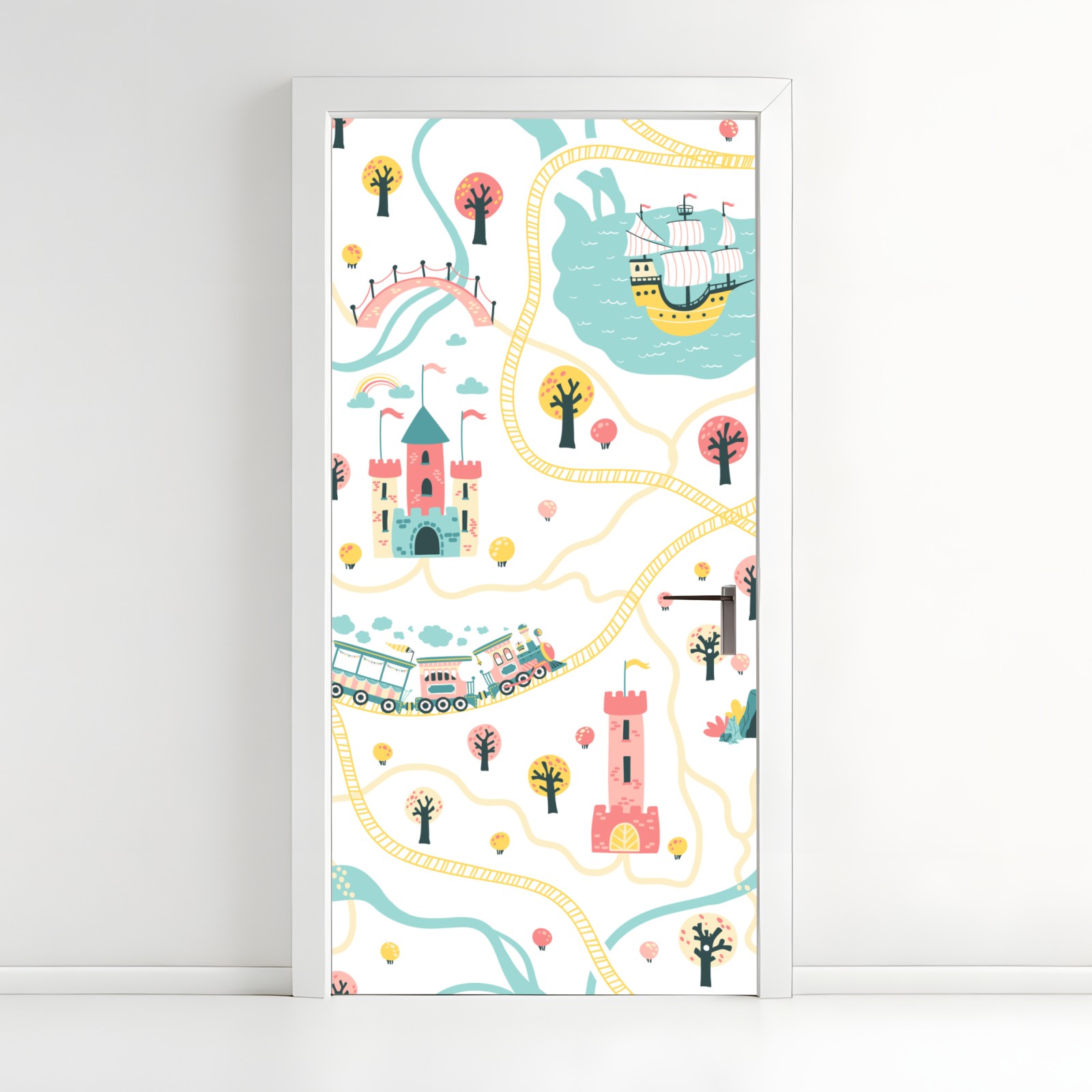 Verleihe dem Kinderzimmer märchenhaften Charme mit dieser pastellfarbenen Karte voller Schlösser, Züge, Drachen und freundlicher Landschaften.