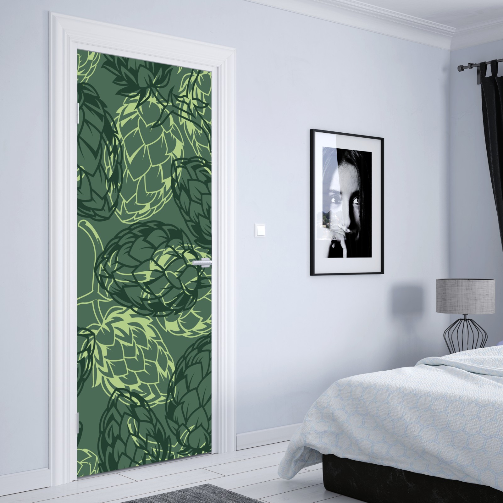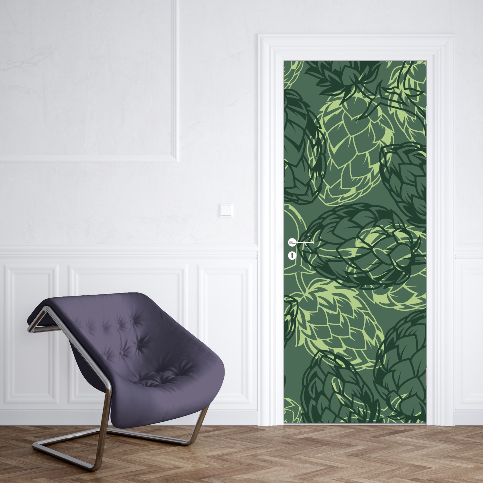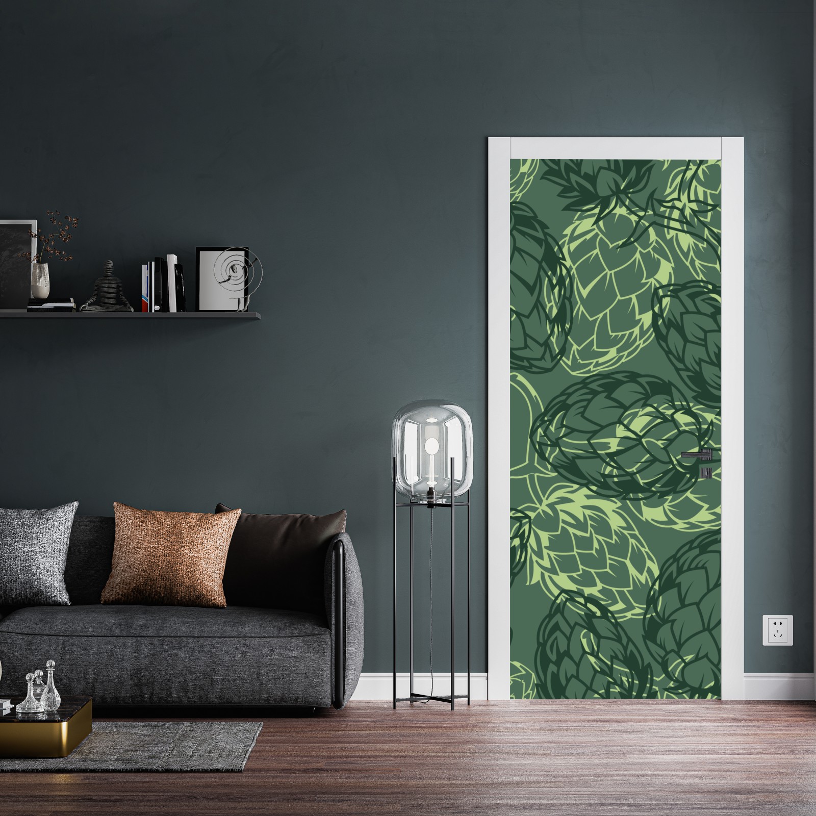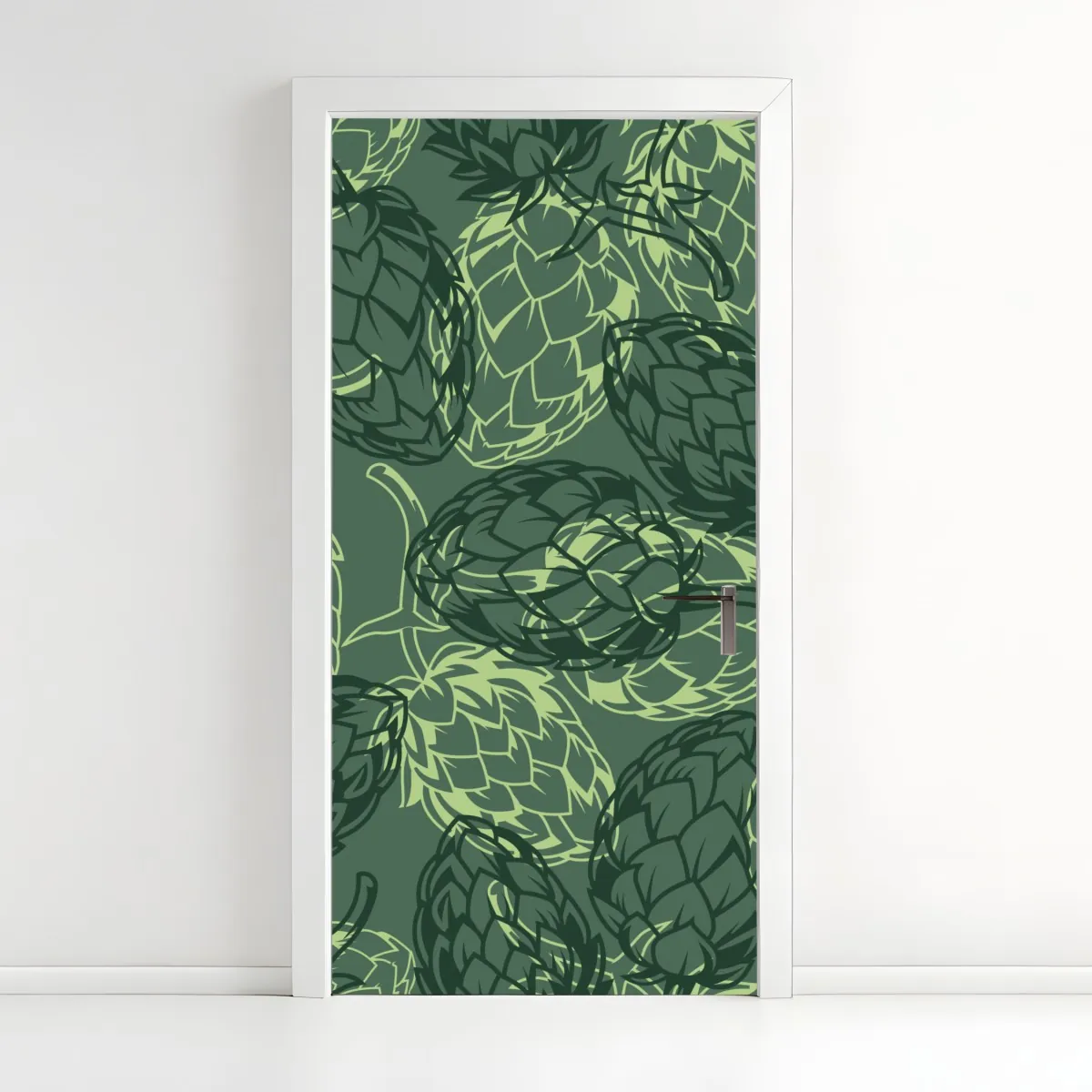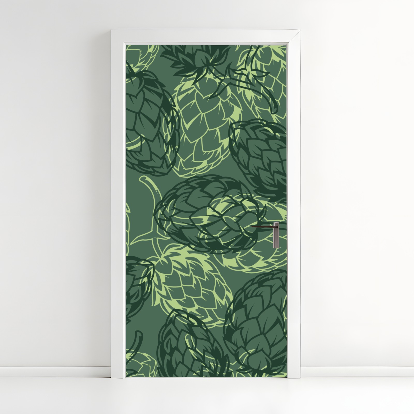 Ein mehrschichtiges Hopfenmuster in grünen Tönen, das rustikales Brauereiflair und botanische Textur in jeden Raum bringt.
