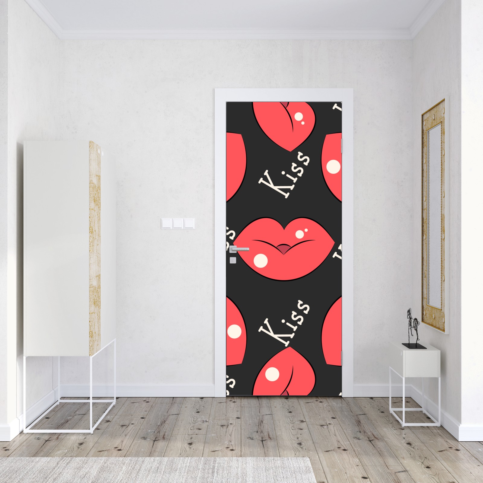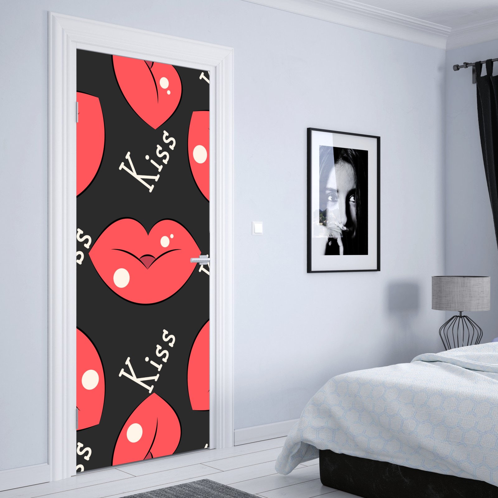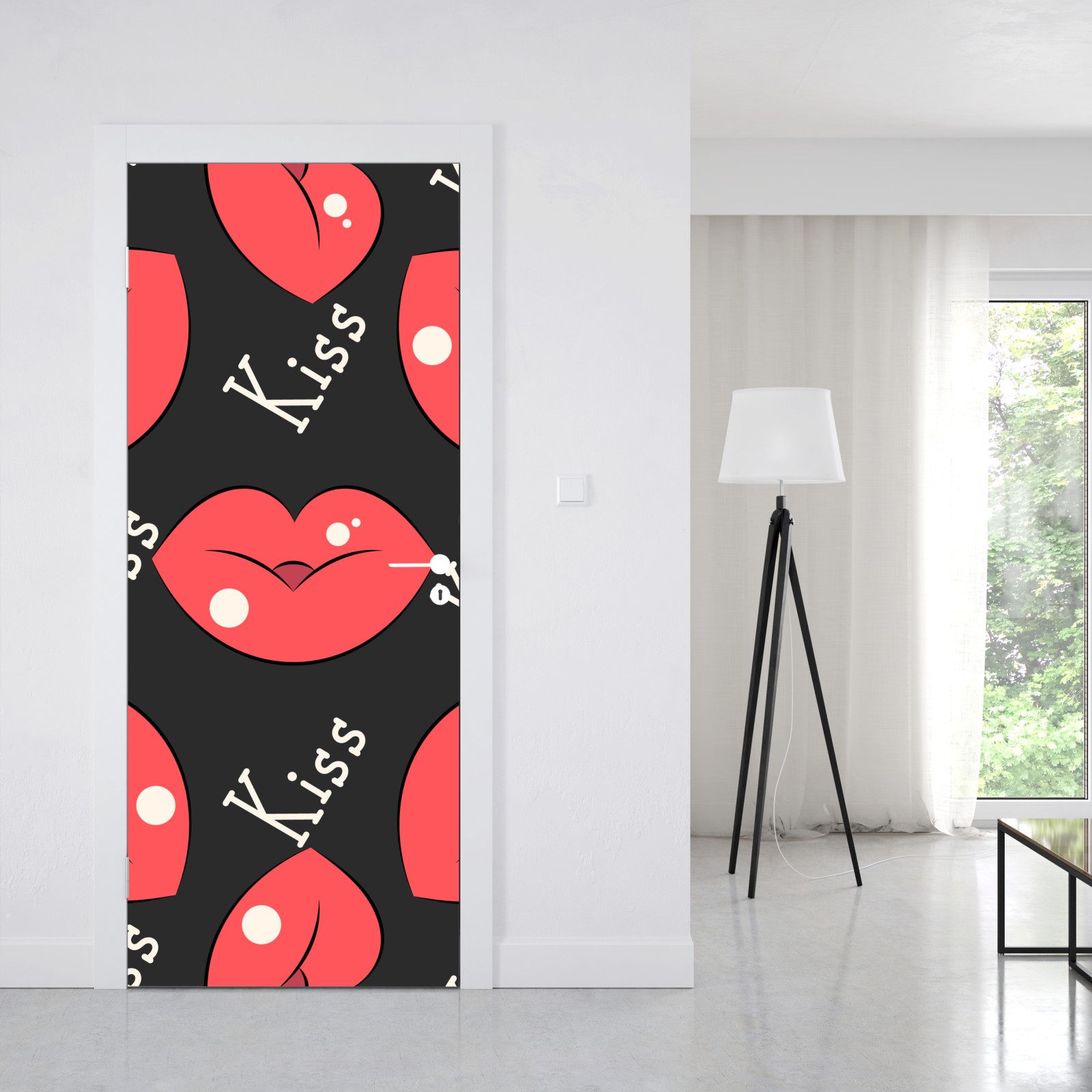 Kräftige rosa Lippen und der Schriftzug 'Kiss' bilden ein verspieltes, zeitgemäßes Muster, das Schlafzimmer und kreative Räume belebt.