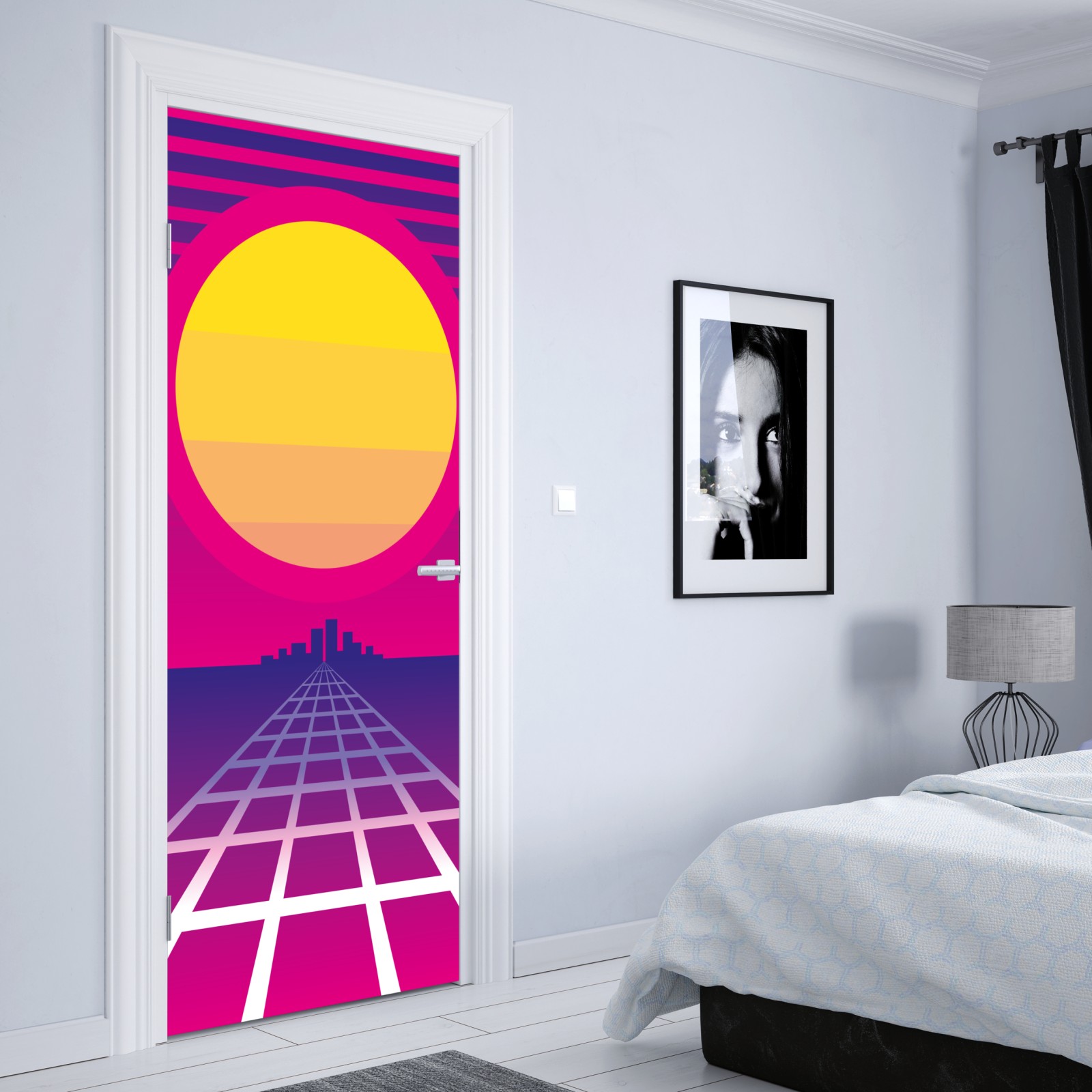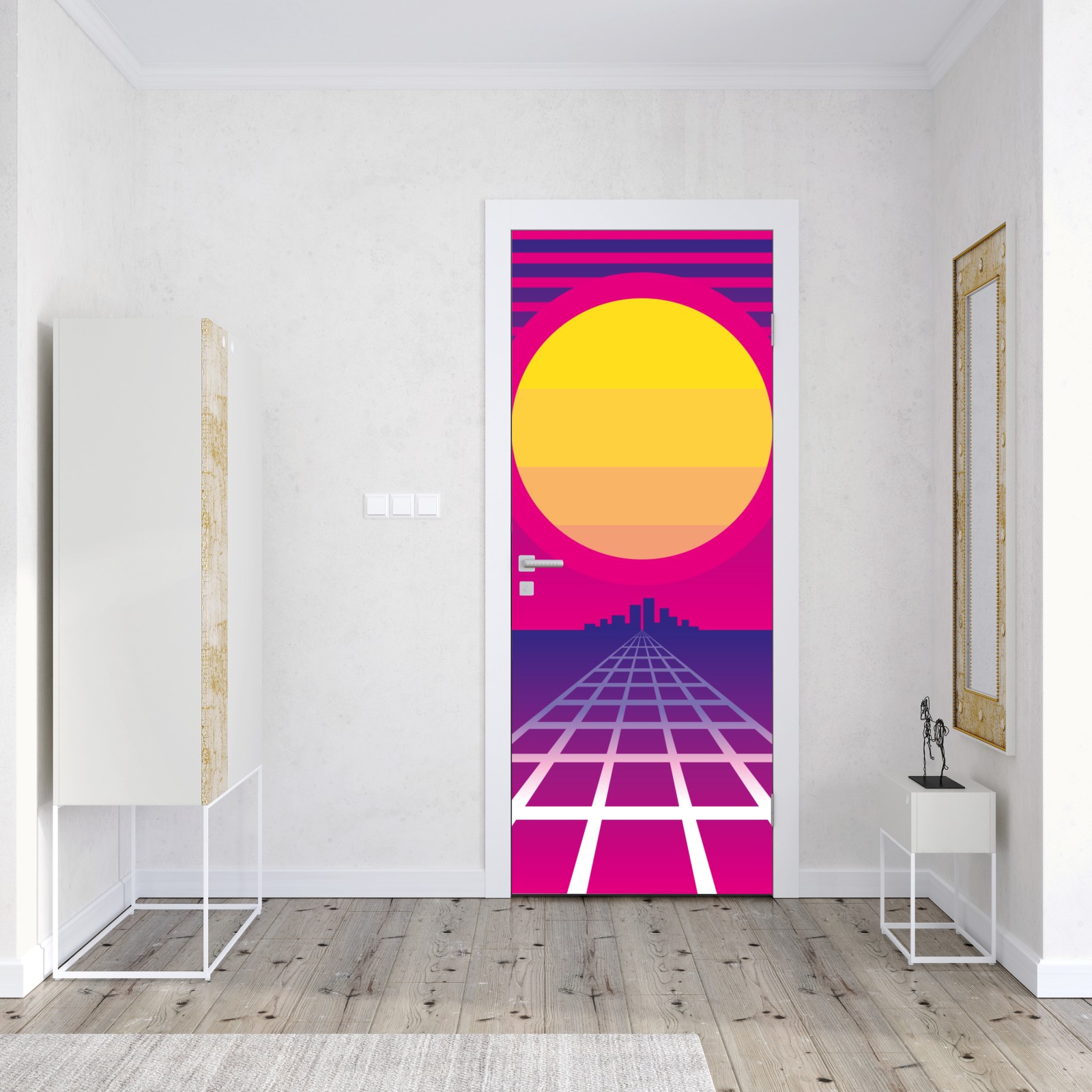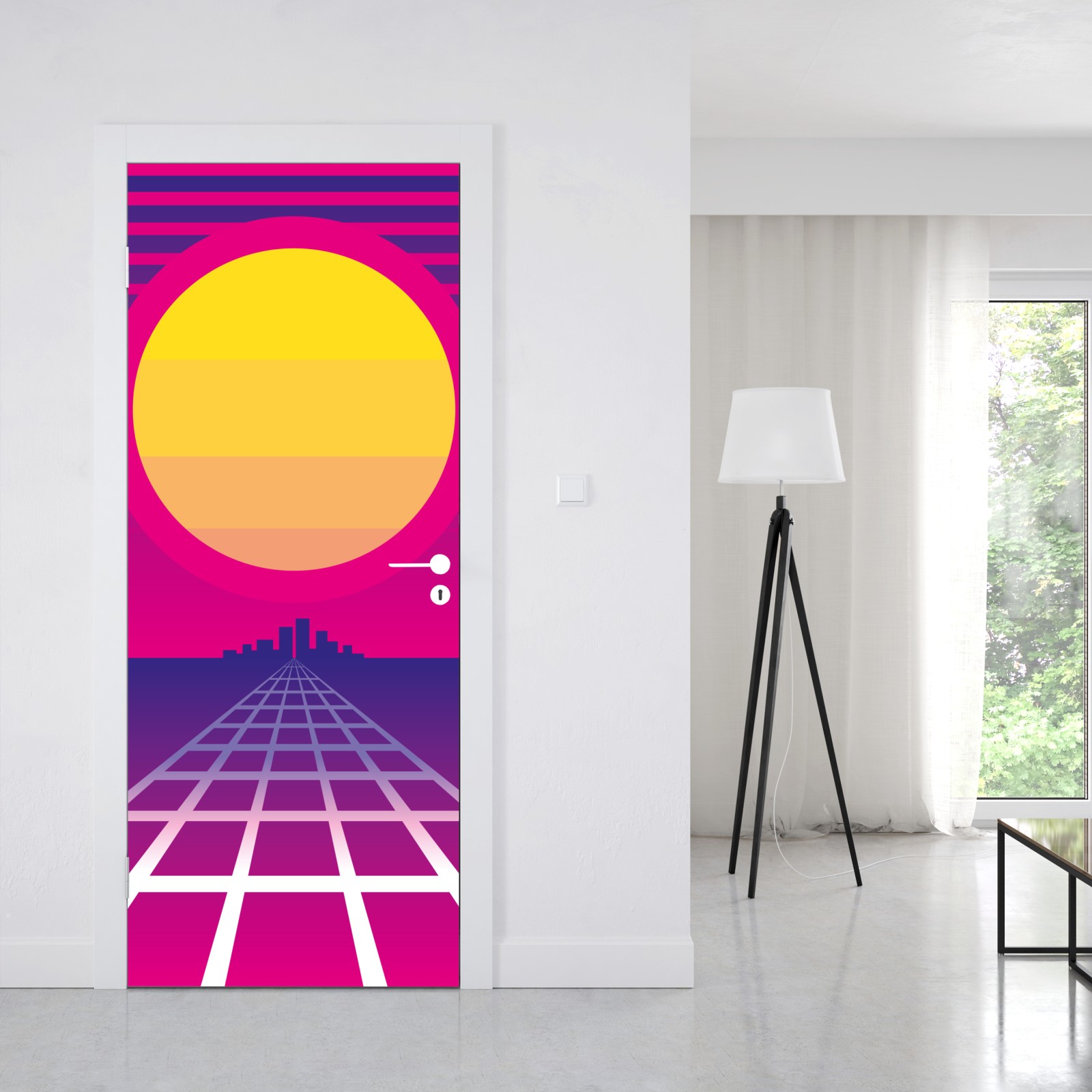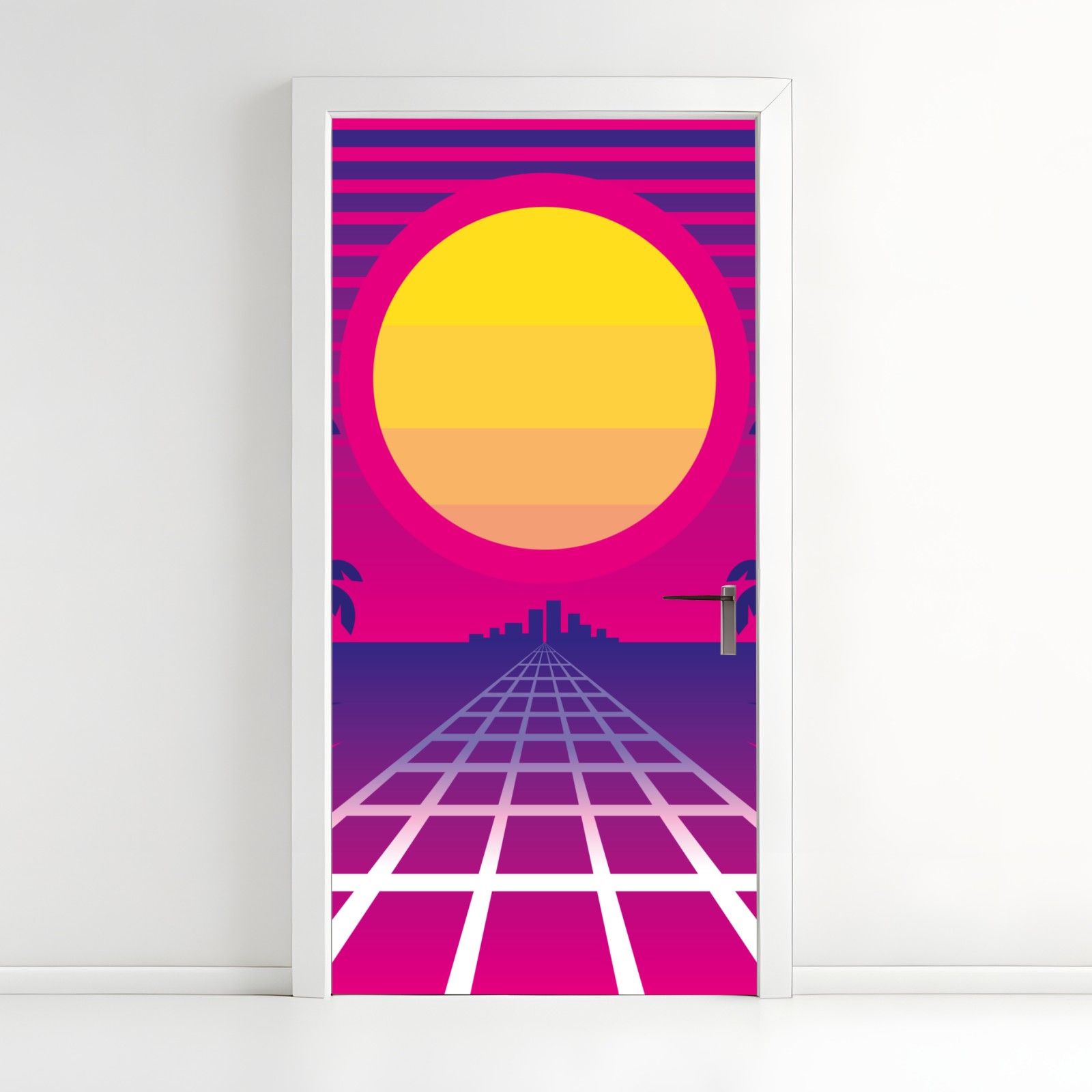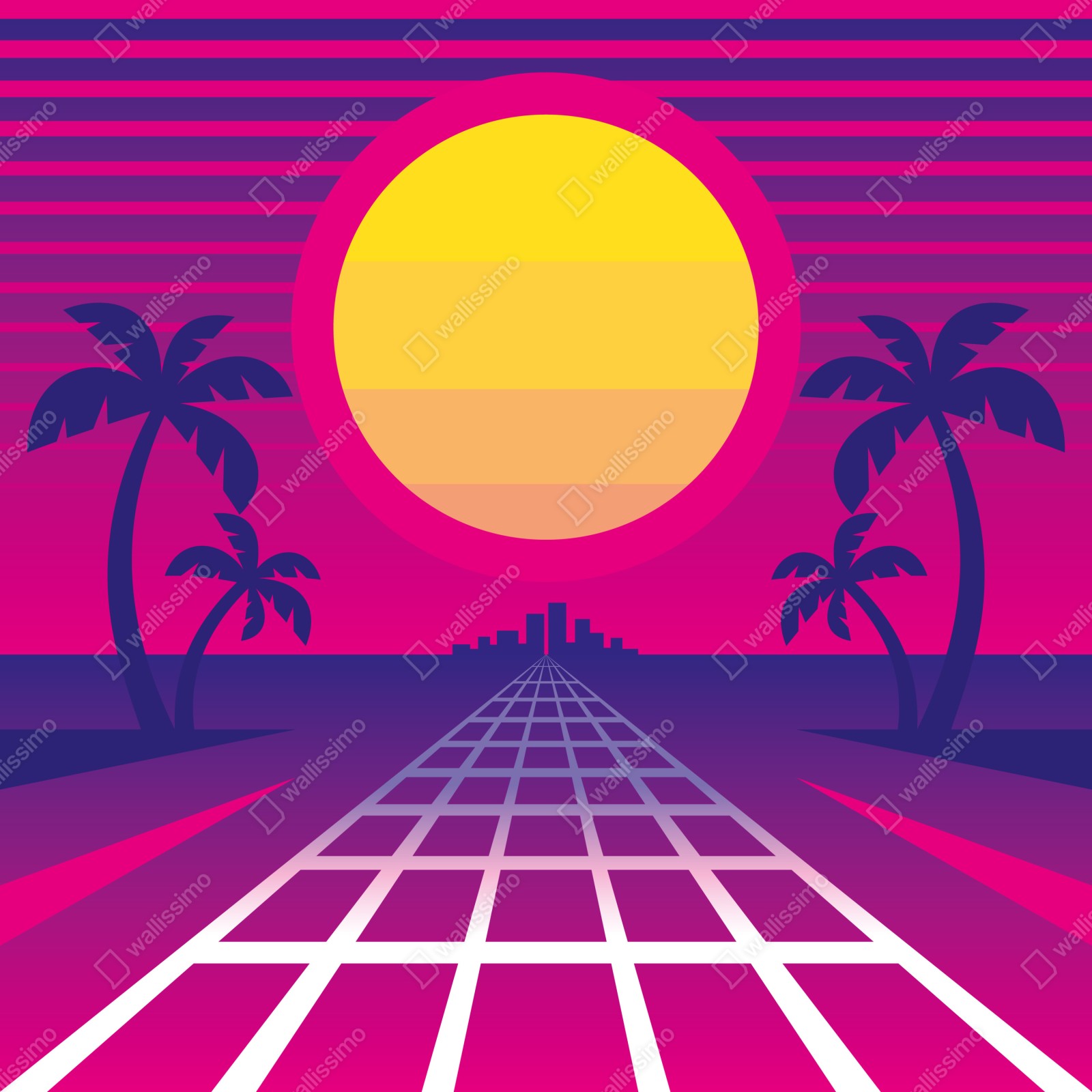 leuchtender retro-futuristischer sonnenuntergang mit neonfarben, palmensilhouetten und einem raster, das zu einer fernen stadtsilhouette führt — perfekt, um jedem raum einen 80er-synthwave-charme zu verleihen.