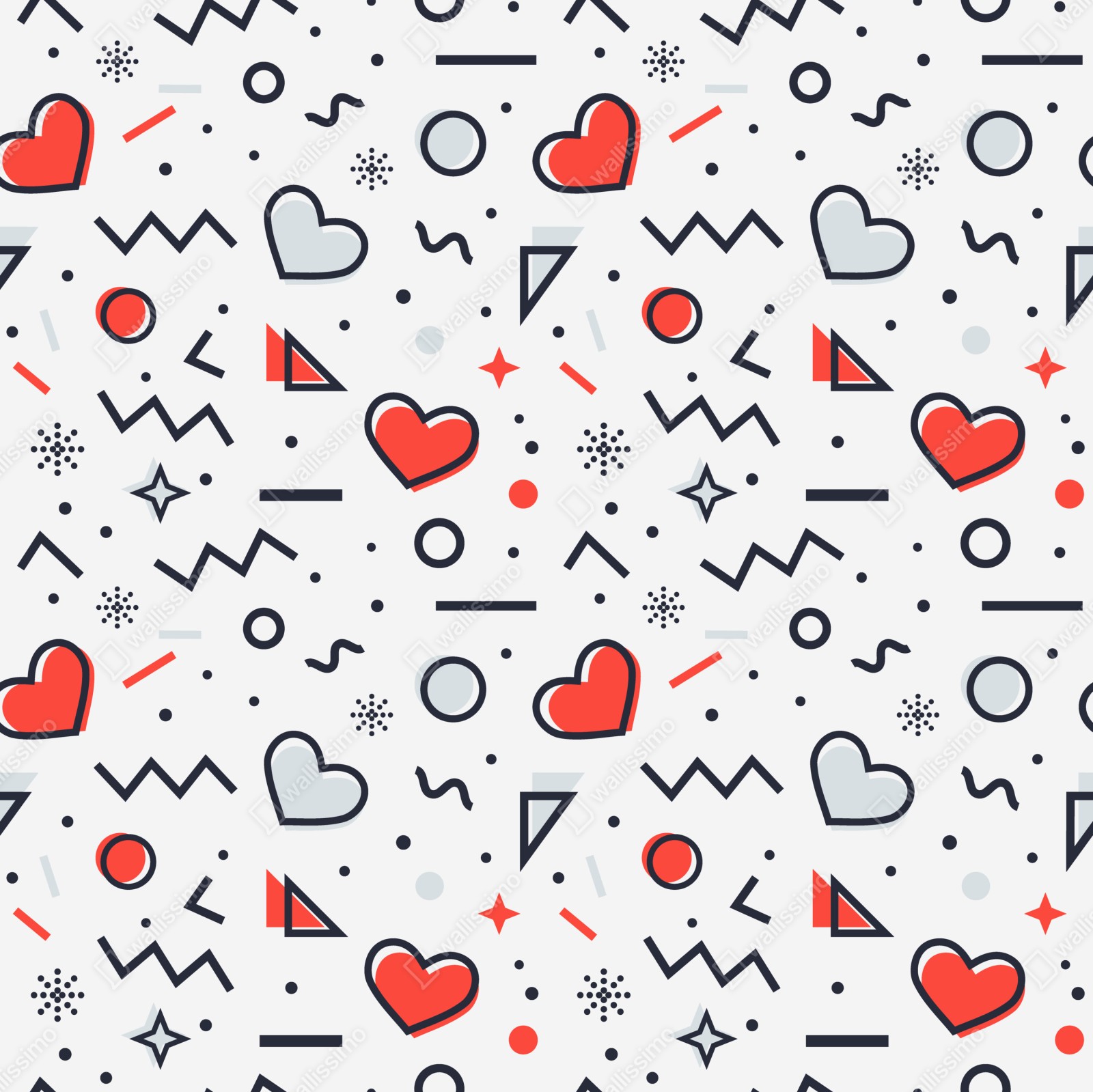 Ein fröhliches nahtloses Muster mit Herzen und geometrischen Formen, das modernen Charme ins Kinderzimmer oder Schlafzimmer bringt.
