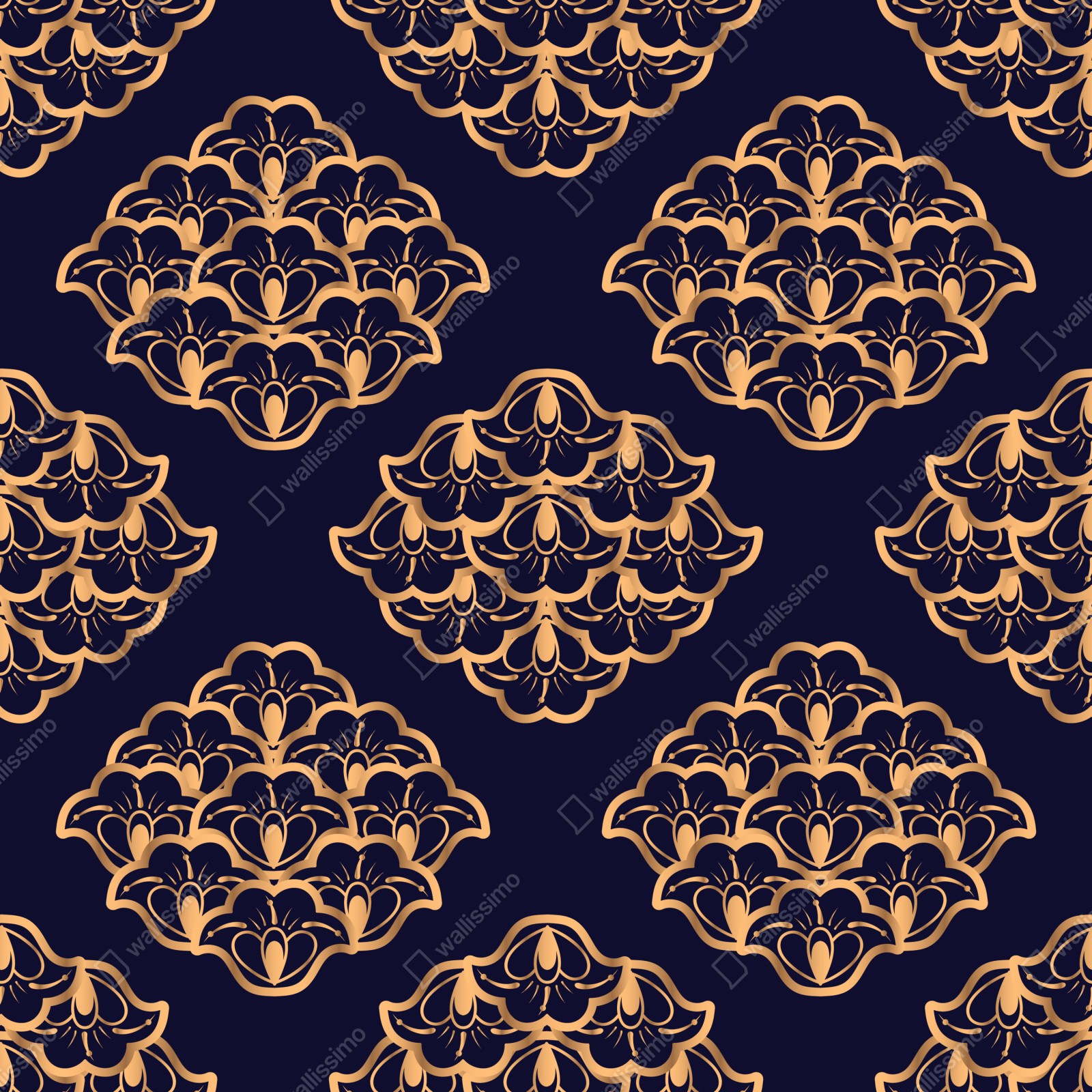 Elegantes goldenes Damastmuster auf tiefem Marineblau verleiht jedem Raum luxuriösen und zeitlosen Charakter.
