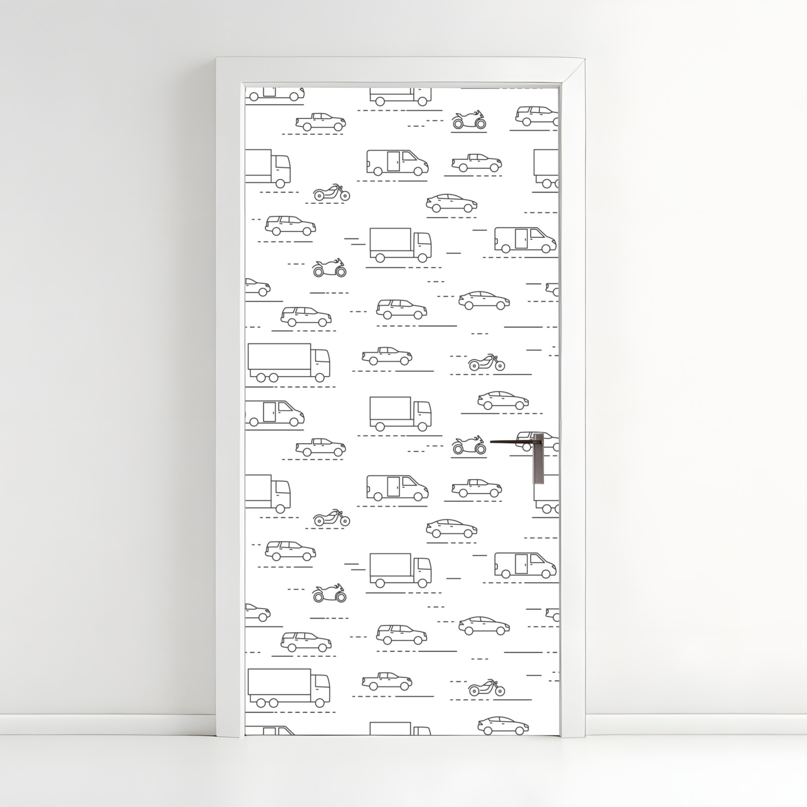 Klares monochromes nahtloses Muster mit Autos, Lastwagen, Lieferwagen und Motorrädern, ideal für Kinderzimmer und minimalistische Innenräume.