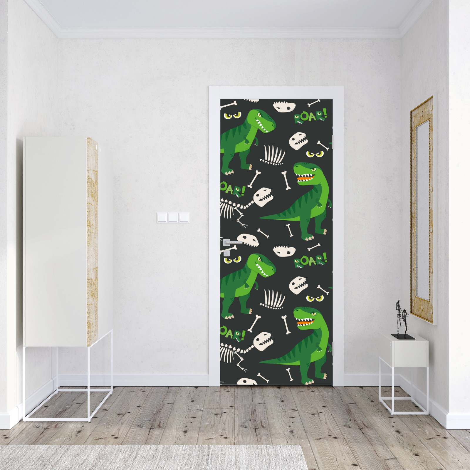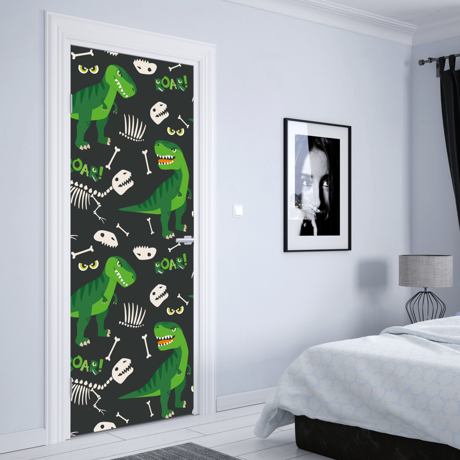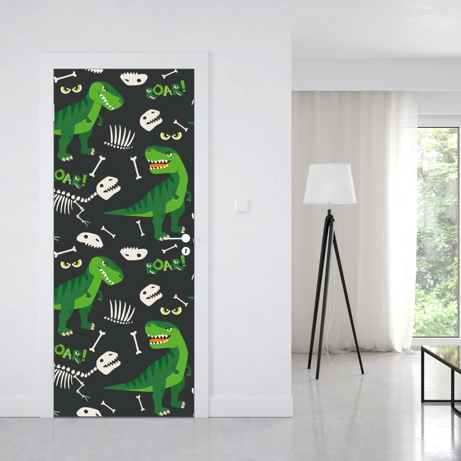verspieltes cartoon-t-rex und fossilienmotiv in kräftigem grün auf dunklem hintergrund verleiht dem kinderzimmer eine lebhafte, freundliche atmosphäre.