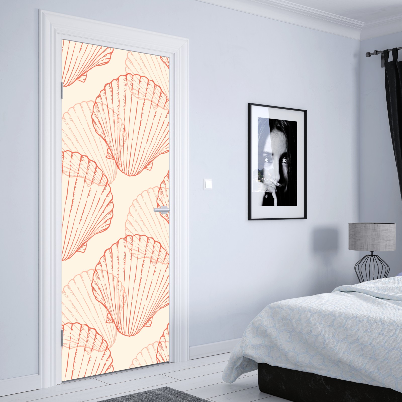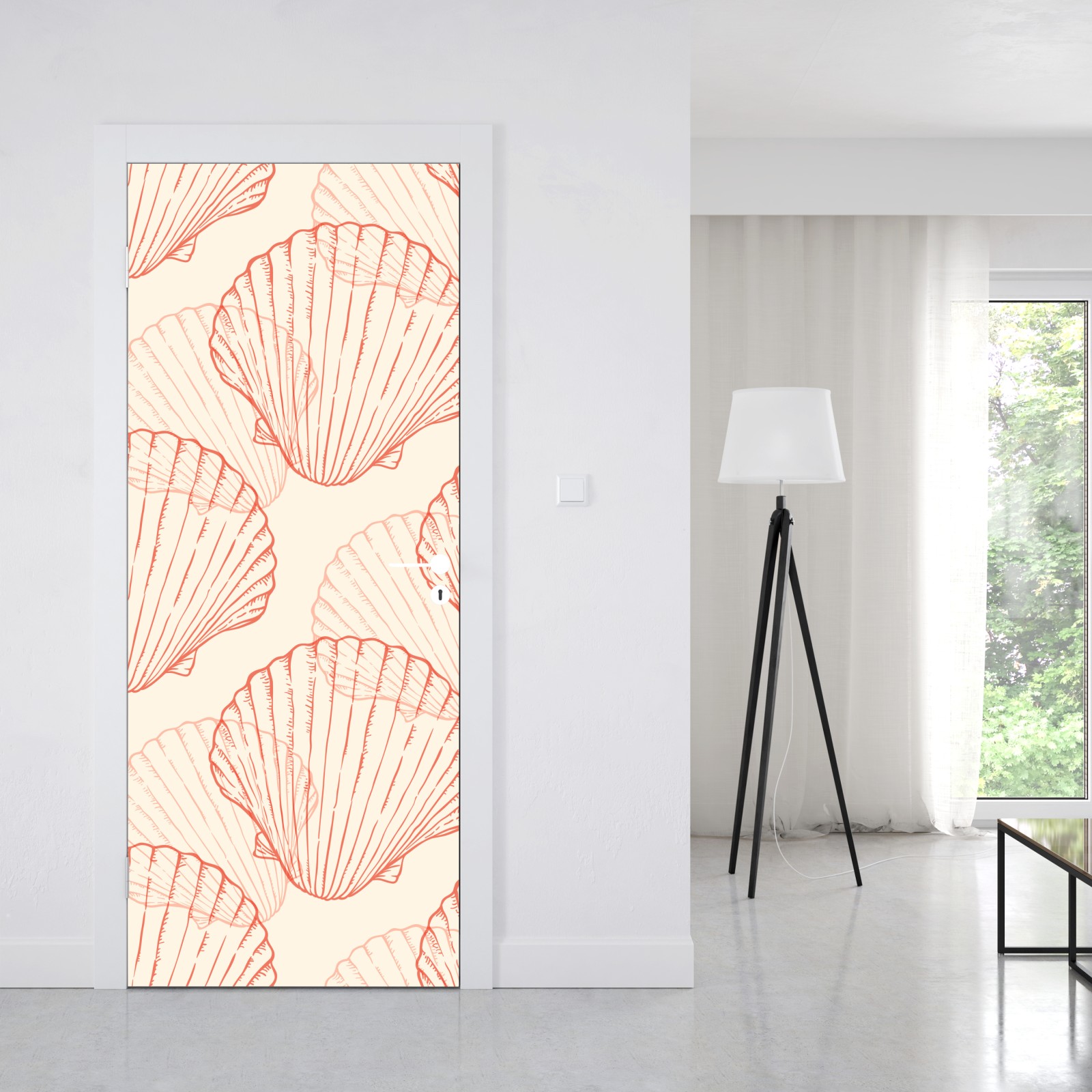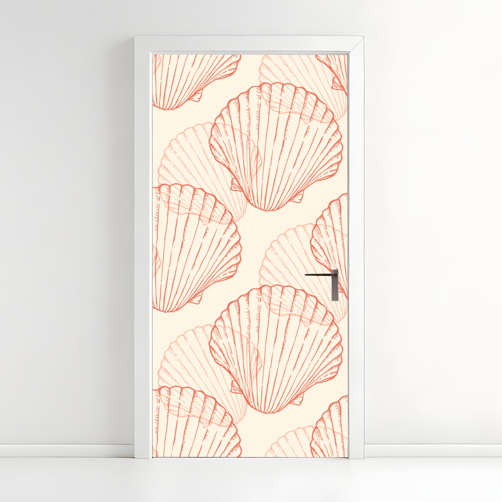 Zarte korallenfarbene Jakobsmuscheln auf warmem beigen Hintergrund schaffen ein beruhigendes maritimes Muster ideal für Badezimmer oder Stranddekor.