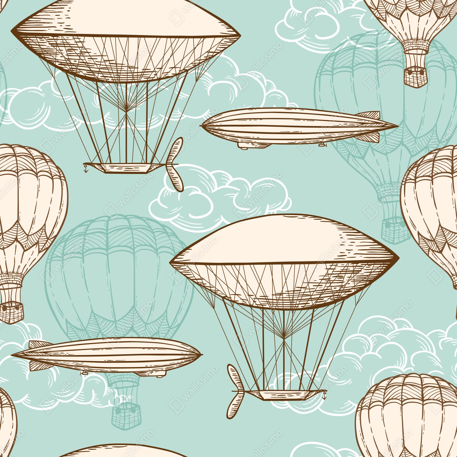 zauberhafte retro-illustration mit luftschiffen und heißluftballons auf türkisfarbenem hintergrund, ideal für kinderzimmer oder als wanddeko.